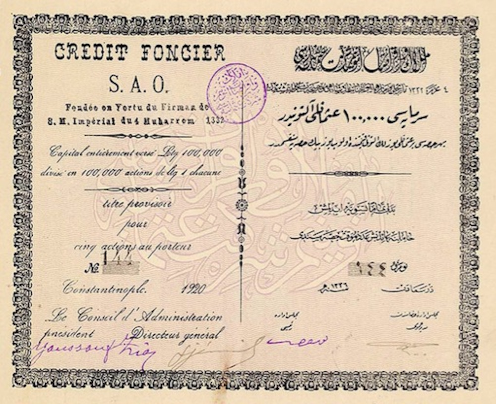 A-61497Credit Foncier S.A.O.-1Costantinopoli1920Titolo provvisorio da 5 azioni al portatoreR1 (Più di 5000 pezzi)S1 (da 0 a 25 €)