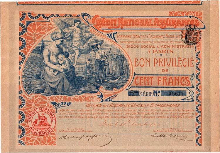 Credit National d'Assurances Mutuelles - buono privilegiato al portatore di 100 FF. Paris 26 dicembre 1902. Raffinato fronte in stile Liberty con immagine emblematica: madre che allatta, lavoratori all’opera nei campi ed angelo che elargisce monete estratte da una cornucopia. Timbro della società con figura femminile simbolica che regge il fascio repubblicano francese. La compagnia praticava l’assicurazione mutua che, contrapponendosi a quella a premio, esclude la componente del profitto da parte dell’intermediario assicuratore. Nella formula mutua gli assicurati diventano soci, versando il contributo necessario per la sopportazione collettiva del rischio.