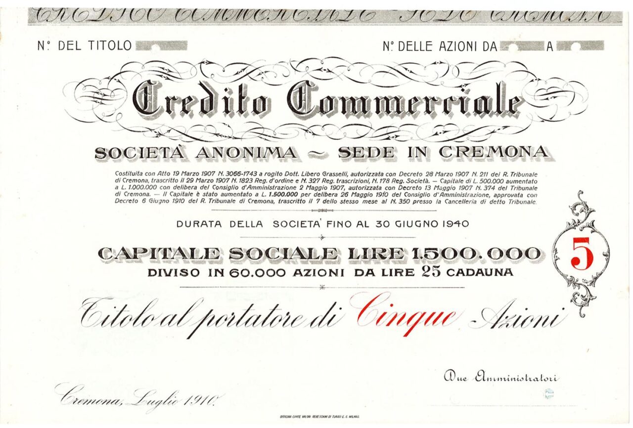 B-42894Credito Commerciale-1Cremona19101 azione al portatore da lire 25R2 (1001-5000 pezzi)S2 (da 26 a 50 €)