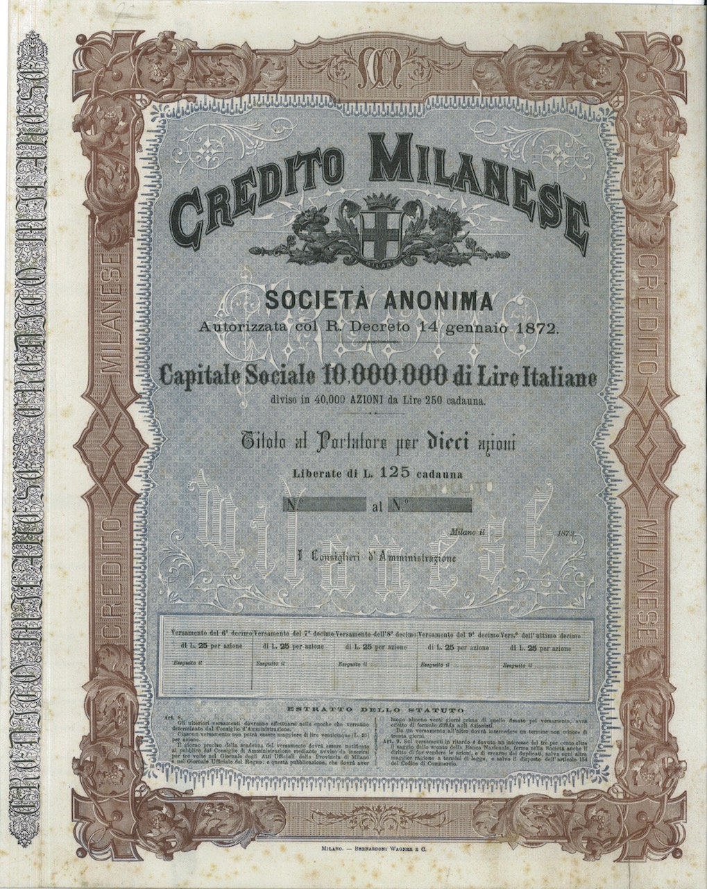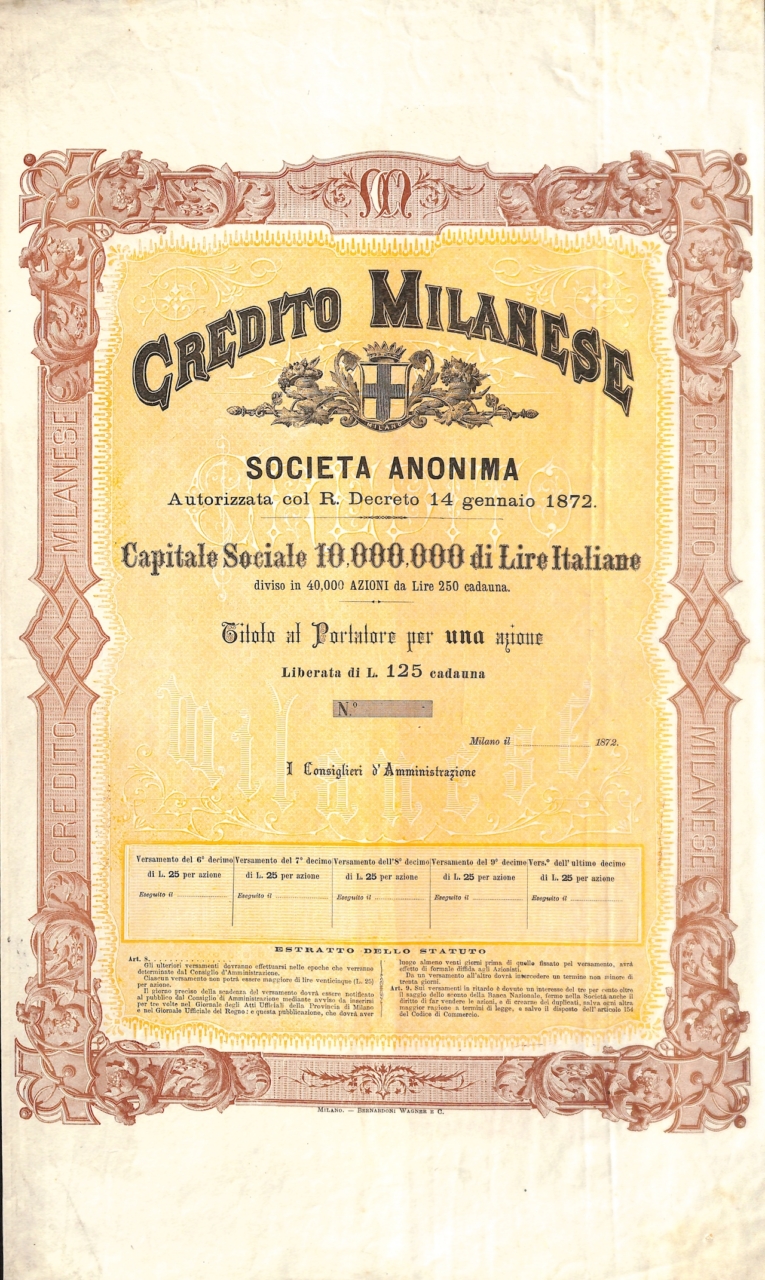 A-5166Credito Milanese-1Bernardoni Wagner e C. - MilanoMilano18721 azioneR4 (251-500 pezzi)S4 (da 101 a 250 €)