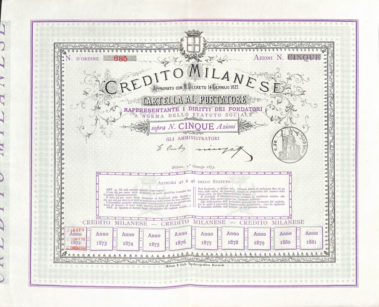 C-5166Credito Milanese-3R. Stab. Tipolitografico Ricordi – MilanoMilano18735 azioniR4 (251-500 pezzi)S4 (da 101 a 250 €)