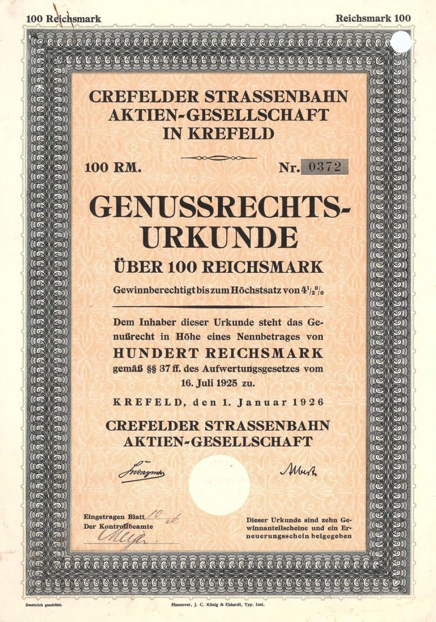 A-73689Crefelder Strassenbahn AG in Krefeld-1Krefeld1926Attestato di partecipazione agli utili da 100 MarchiR4 (251-500 pezzi)S5 (da 251 a 500 €)