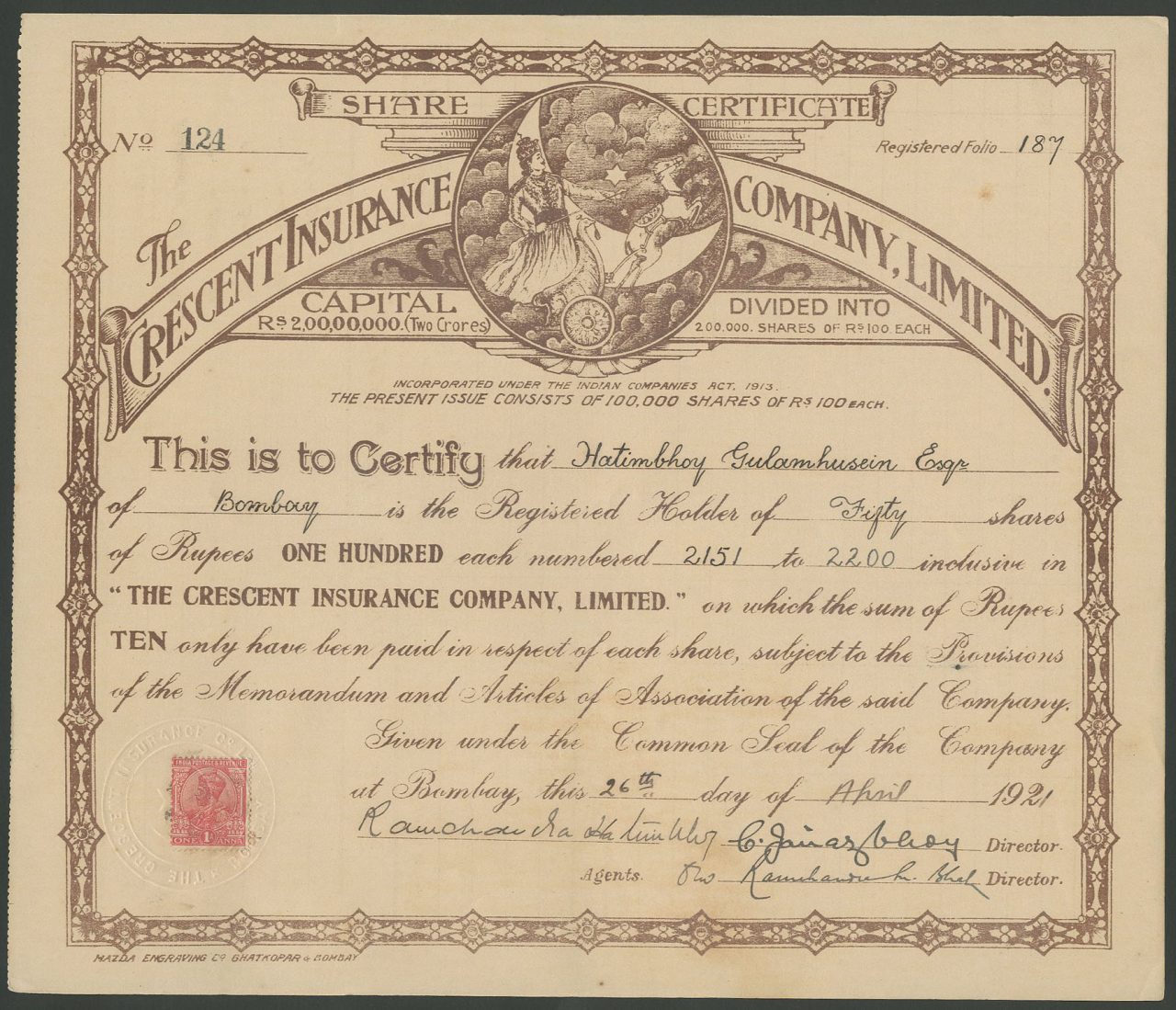 Incorporato ai sensi dell’Indian Companies Act del 1913. Capitale 2.00.000.000 di rupie in azioni di 100 rupie. Ridotto a 1,88,00.000 rupie in azioni di 15 rupie 10 annas 8 torte.
