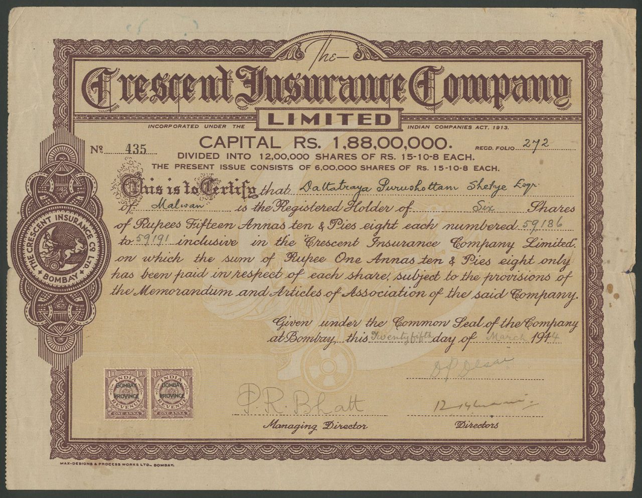 Incorporato ai sensi dell’Indian Companies Act del 1913. Capitale 2.00.000.000 di rupie in azioni di 100 rupie. Ridotto a 1,88,00.000 rupie in azioni di 15 rupie 10 annas 8 torte.