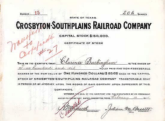 Piccola diramazione, costruita a partire dal 1911, che va dalla linea principale diritta dal confine di stato New Mexico / Texas vicino a Texico a Coleman presso l’importante Lubbock Jct. per 38 miglia verso est fino a Crosbyton. Atchison, Topeka & Santa Fè RR era indirettamente l’unico azionista di South Plains & Santa Fè RR.