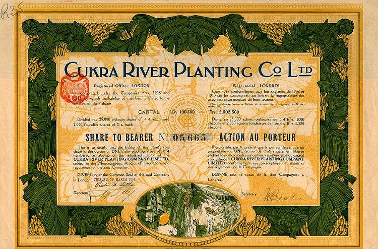 Testo in inglese e francese.La società britannica gestiva piantagioni di banane in Nicaragua. Singolare grafica con caschi di banane nel bordo, in basso lavoratori intenti alla raccolta dei frutti. Ricercato titolo del settore.