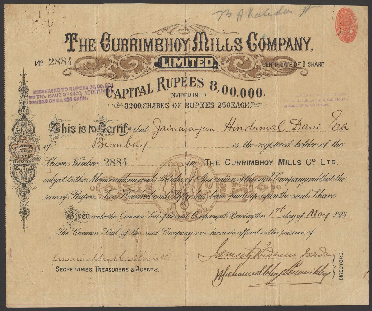 Incorporato ai sensi dell’Indian Companies Act 1882. Capitale 8.000.000 di rupie in azioni di 1.000 rupie, successivamente ridotto a 250 rupie.