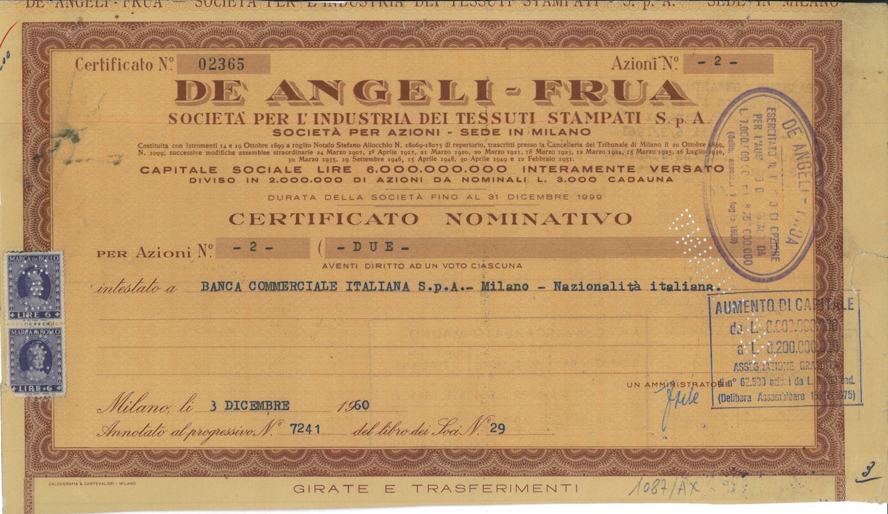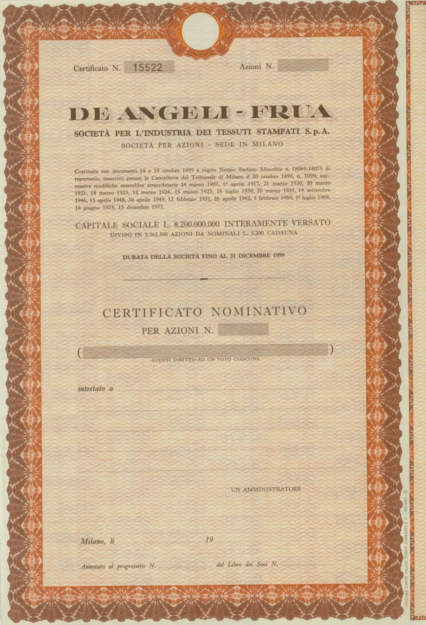 A-10172De Angeli-Frua Soc. per l’Industria dei Tessuti Stampati SpA-1Officina Carte Valori Turati Lombardi e C. - MilanoMilano1899Variabile (cap. soc. 8.200.000.000)R1 (Più di 5000 pezzi)S1 (da 0 a 25 €)
