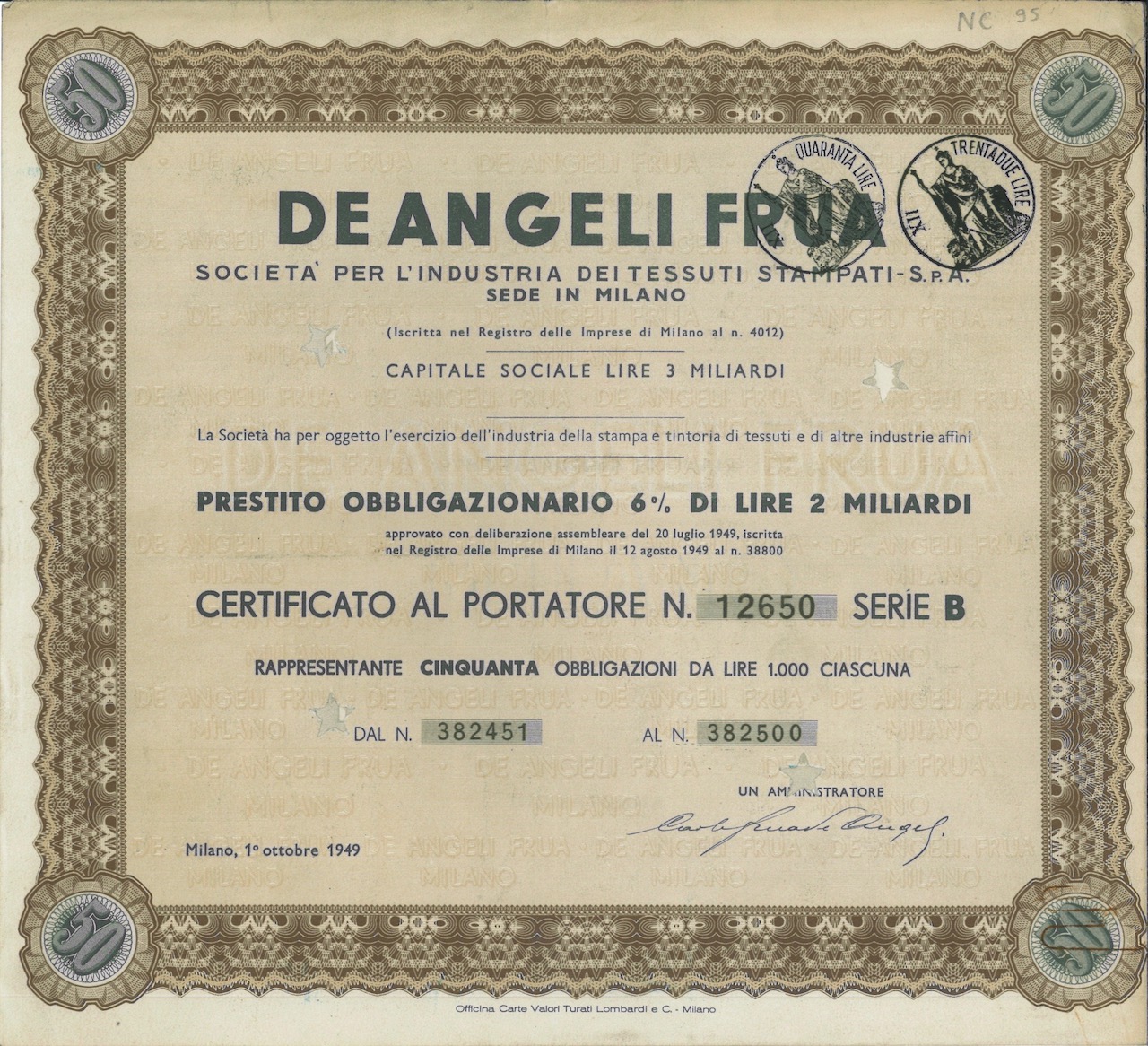 D-10172De Angeli-Frua Soc. per l’Industria dei Tessuti Stampati SpA-4Officina Carte Valori Turati Lombardi e C. - MilanoMilano194950 obbligazioniR1 (Più di 5000 pezzi)S1 (da 0 a 25 €)