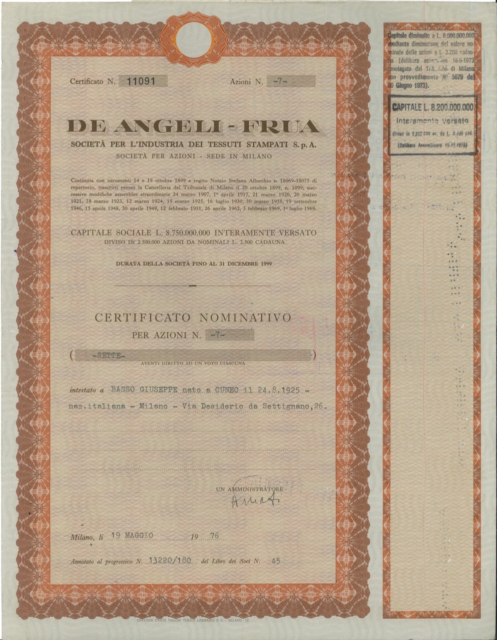 H-10172De Angeli-Frua Soc. per l’Industria dei Tessuti Stampati SpA-8Officina Carte Valori Turati Lombardi e C. - MilanoMilano1976Variabile (cap. soc. 8.750.000.000)R1 (Più di 5000 pezzi)S1 (da 0 a 25 €)