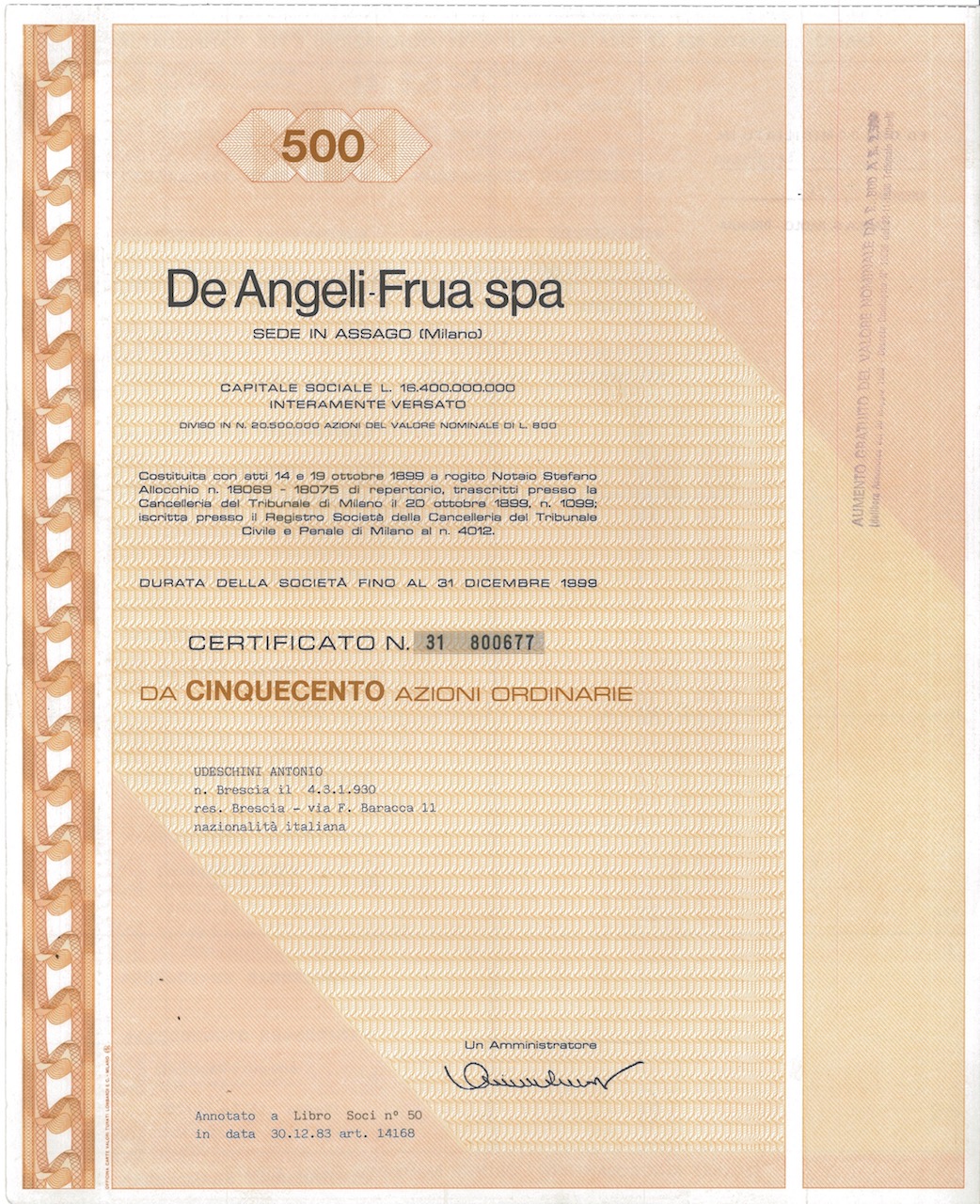 K-10172De Angeli-Frua Soc. per l’Industria dei Tessuti Stampati SpA-11Officina Carte Valori Turati Lombardi e C. - MilanoMilano1983500 azioniR1 (Più di 5000 pezzi)S1 (da 0 a 25 €)