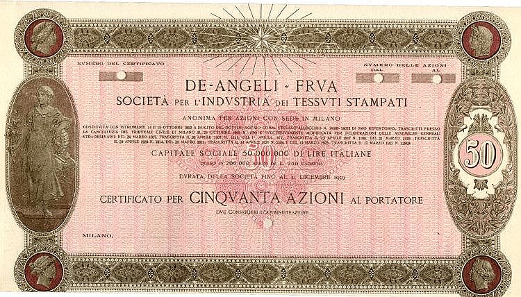 C-10172De Angeli-Frua Soc. per l’Industria dei Tessuti Stampati SpA-3-Milano192550 azioni al portatore da Lire 250R2 (1001-5000 pezzi)S3 (da 51 a 100 €)