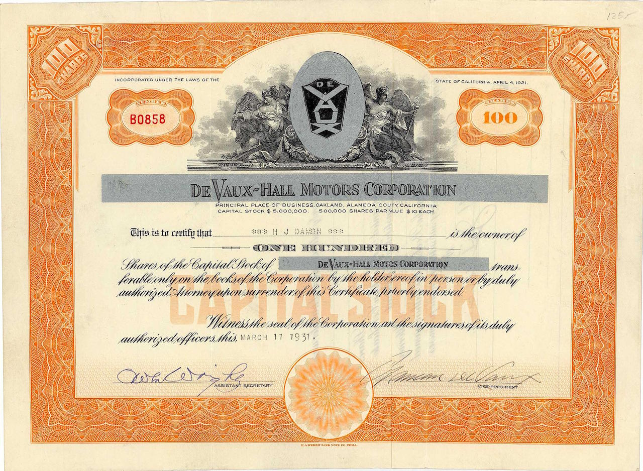 A-61993De Vaux-Hall Motors Corporation-1New York1931100 azioni nominative da 10 $R3 (501-1000 pezzi)S3 (da 51 a 100 €)