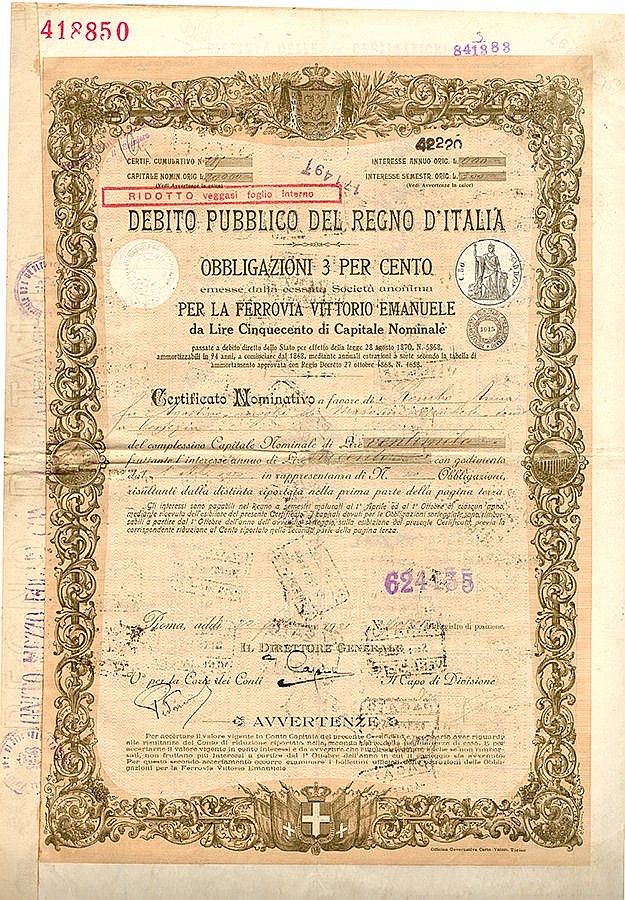 Deb. Pubbl. del Regno d’Italia – Obbligazioni 3 per cento per la Ferrovia Vittorio Emanuele