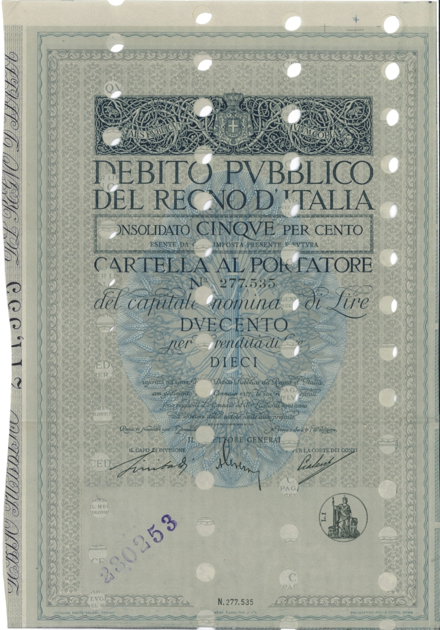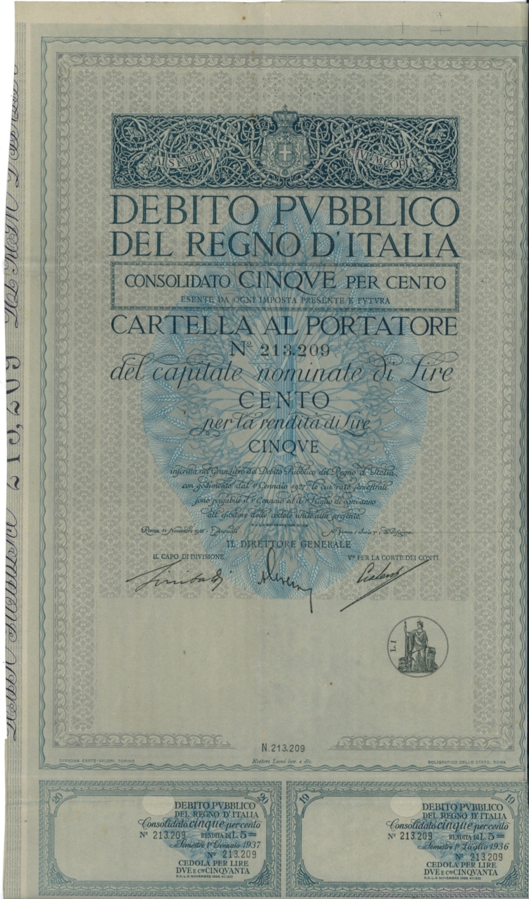 B-15091Deb. Pubbl. del Regno d’Italia – Cons. 5% – Cartella al Port. – Legge 6 Nov. 1926-2Roma1926Lire 200Blu su fondo grigioR4 (251-500 pezzi)S4 (da 101 a 250 €)