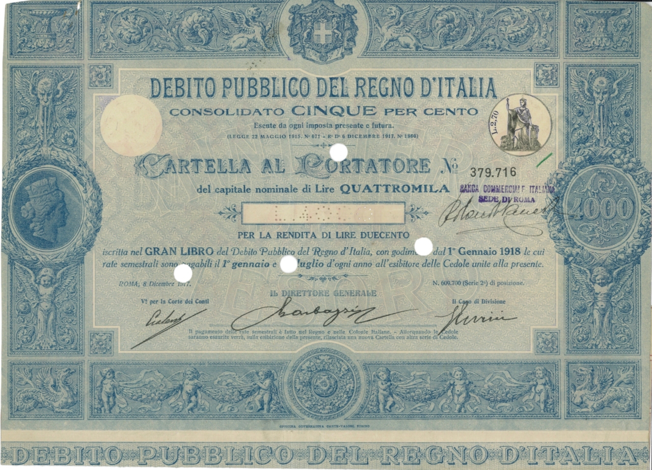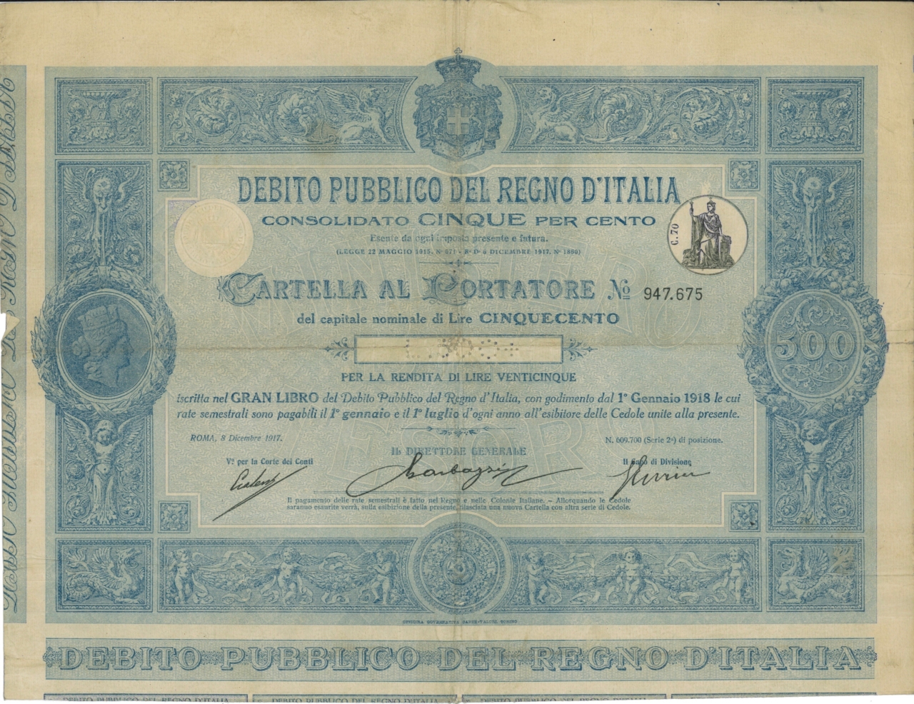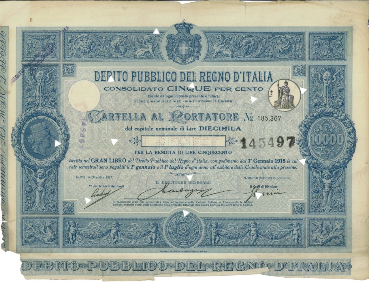 Debito Pubbl. del Regno d’Italia – Consolidato 5% – Cartelle al Port. (Decr. 6 Dicembre 1917)