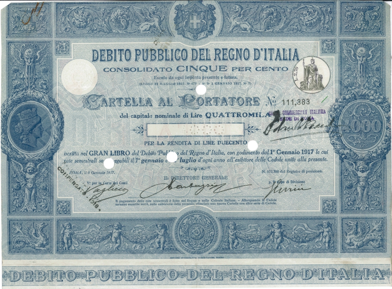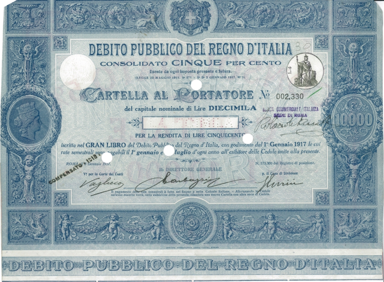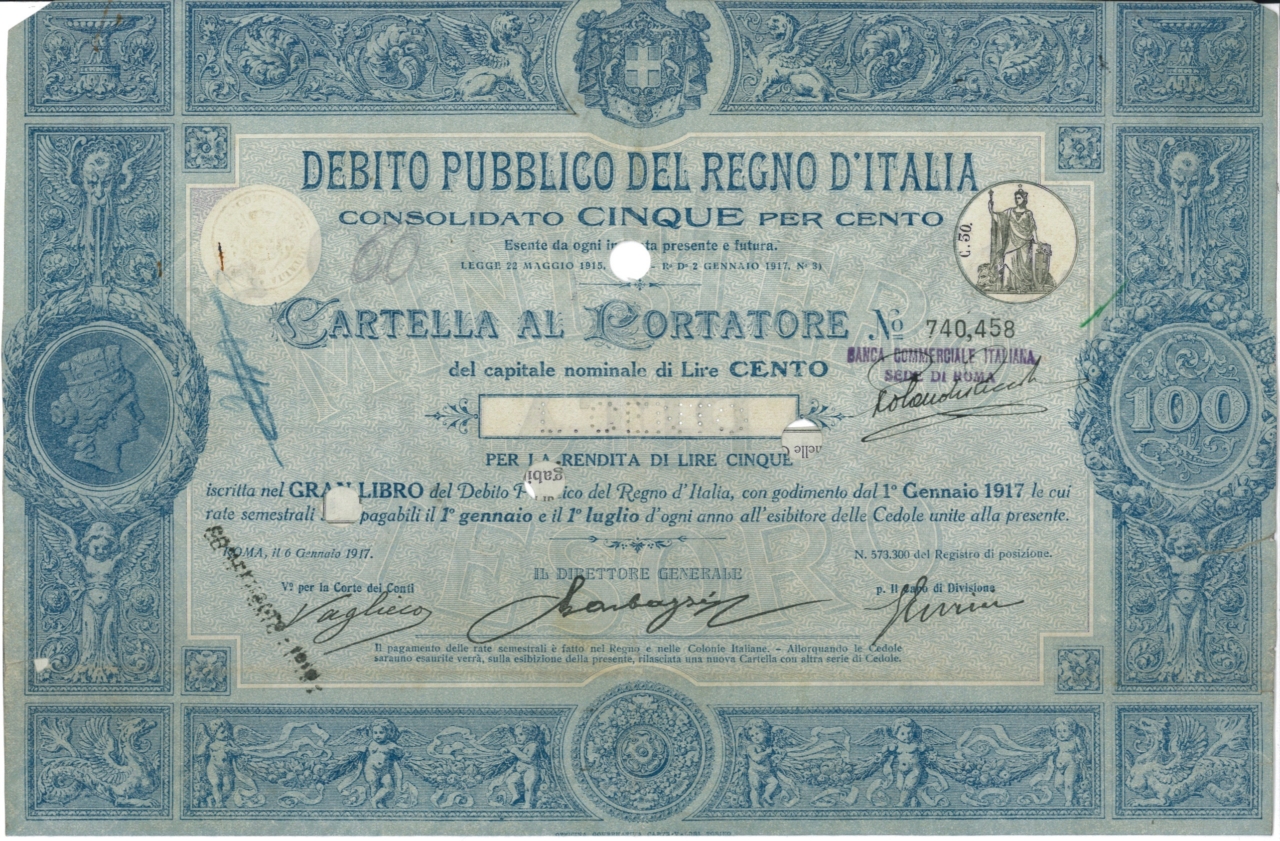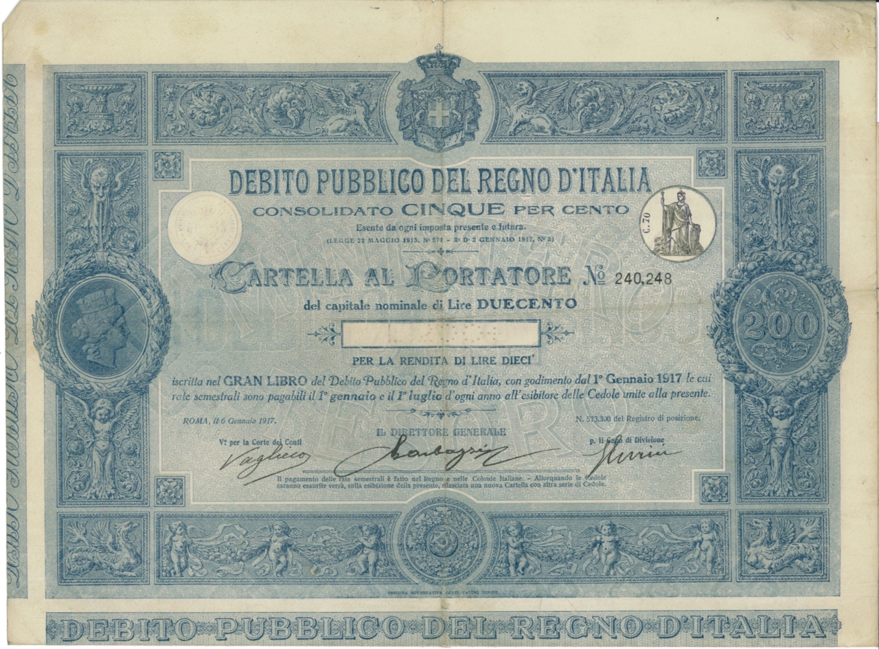 Debito Pubbl. del Regno d’Italia – Consolidato 5% – Cartelle al Port. (Decr. 2 Gennaio 1917)