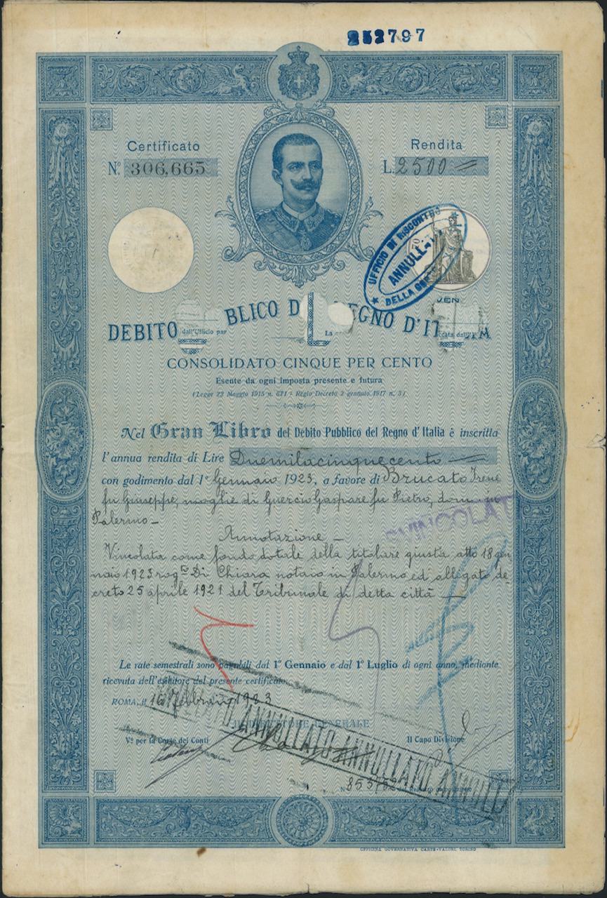 Debito Pubbl. del Regno d’Italia – Consolidato 5% – Certificati Nom.