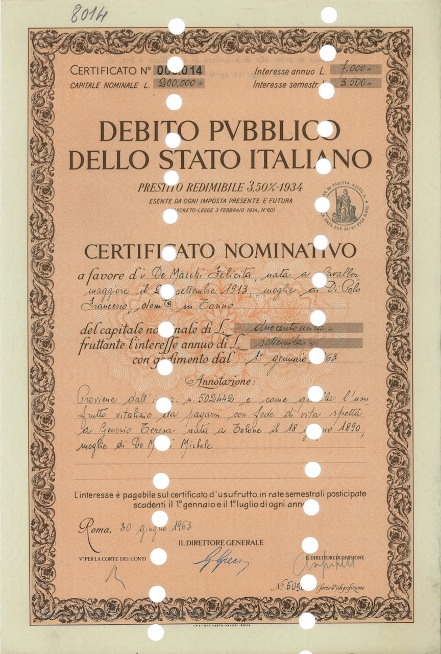 B-15251Debito Pubbl. dello Stato Italiano – Prestito Redim. 3,50% – 1934 – Cert. Nominativi-2Roma1963VariabileArancioneR2 (1001-5000 pezzi)S2 (da 26 a 50 €)