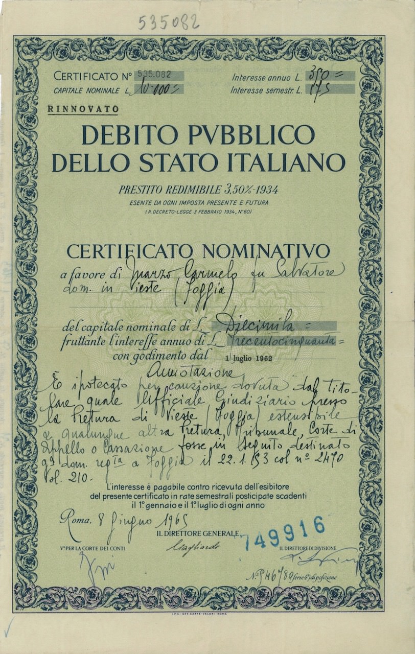 A-15251Debito Pubbl. dello Stato Italiano – Prestito Redim. 3,50% – 1934 – Cert. Nominativi-1Roma1965VariabileVerdeR2 (1001-5000 pezzi)S2 (da 26 a 50 €)
