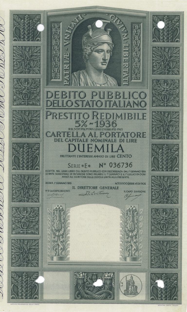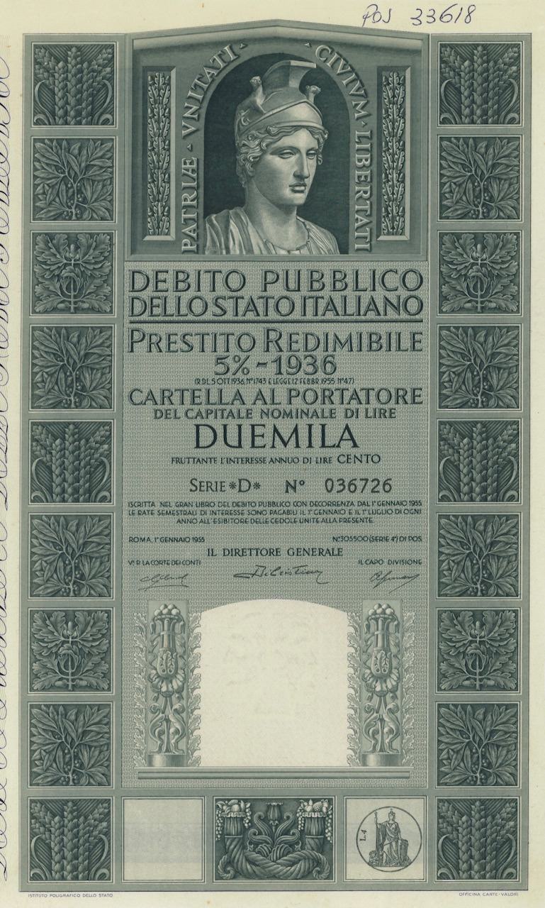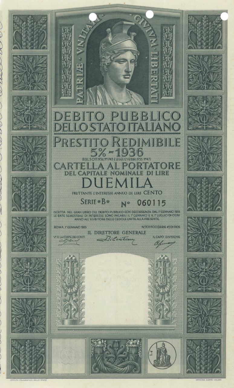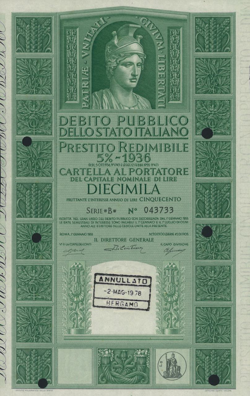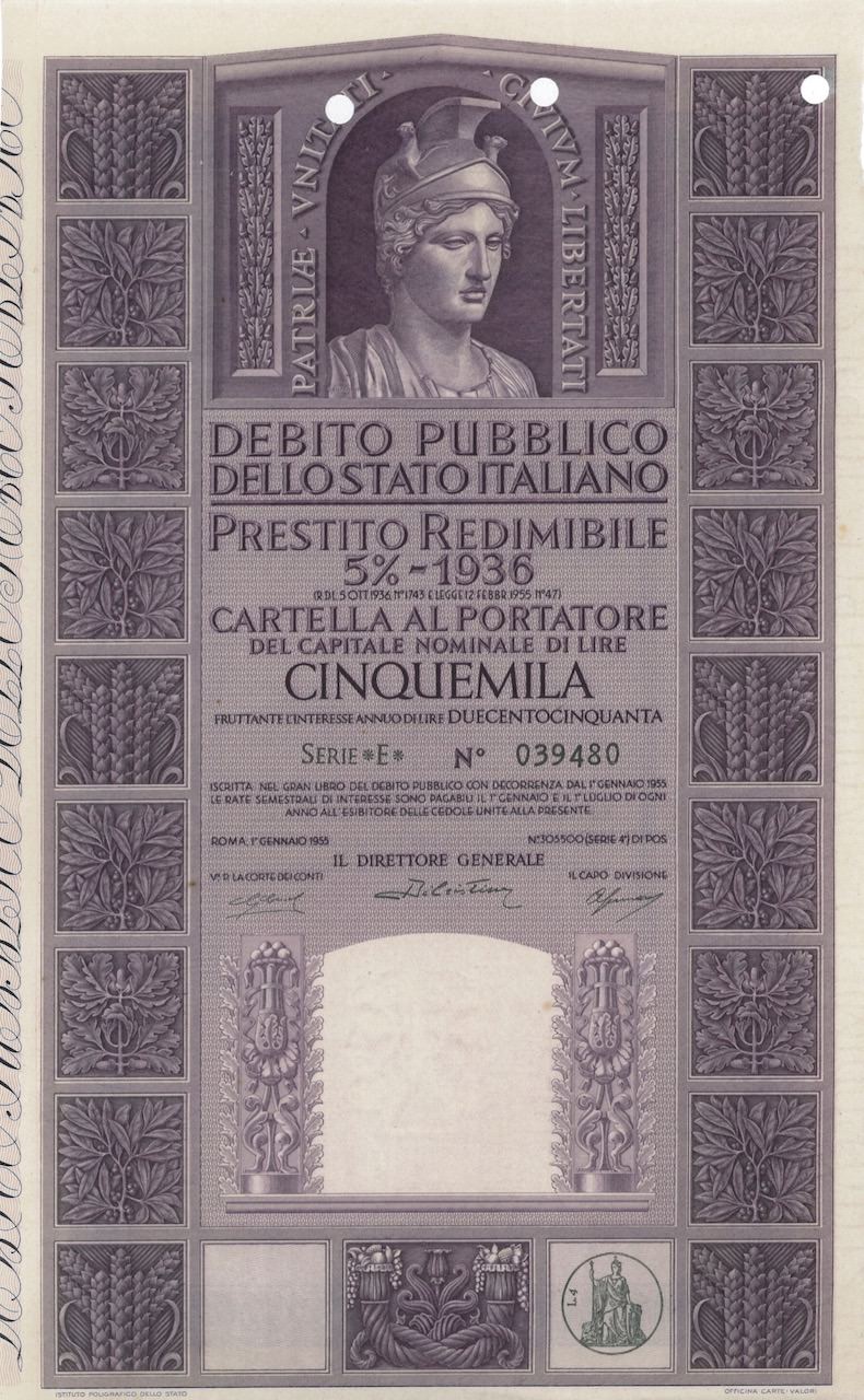 Debito Pubbl. dello Stato Italiano – Prestito Redim. 5% – 1936 – Cart. al Port.