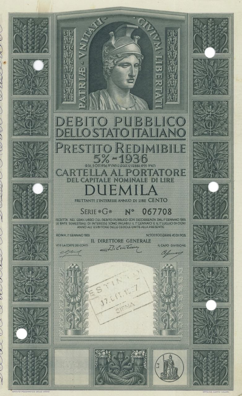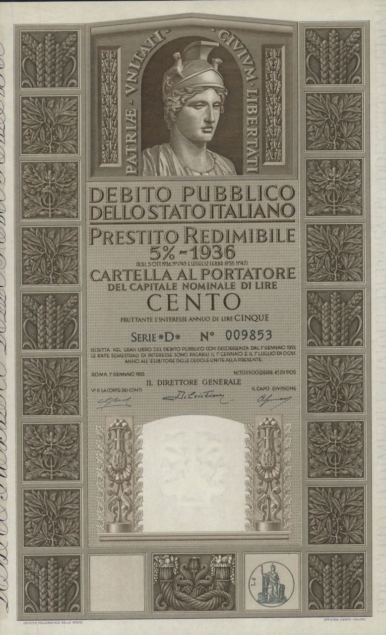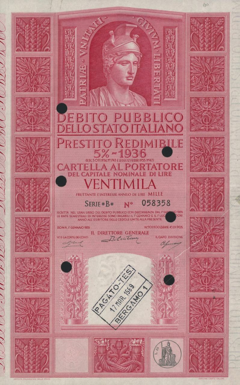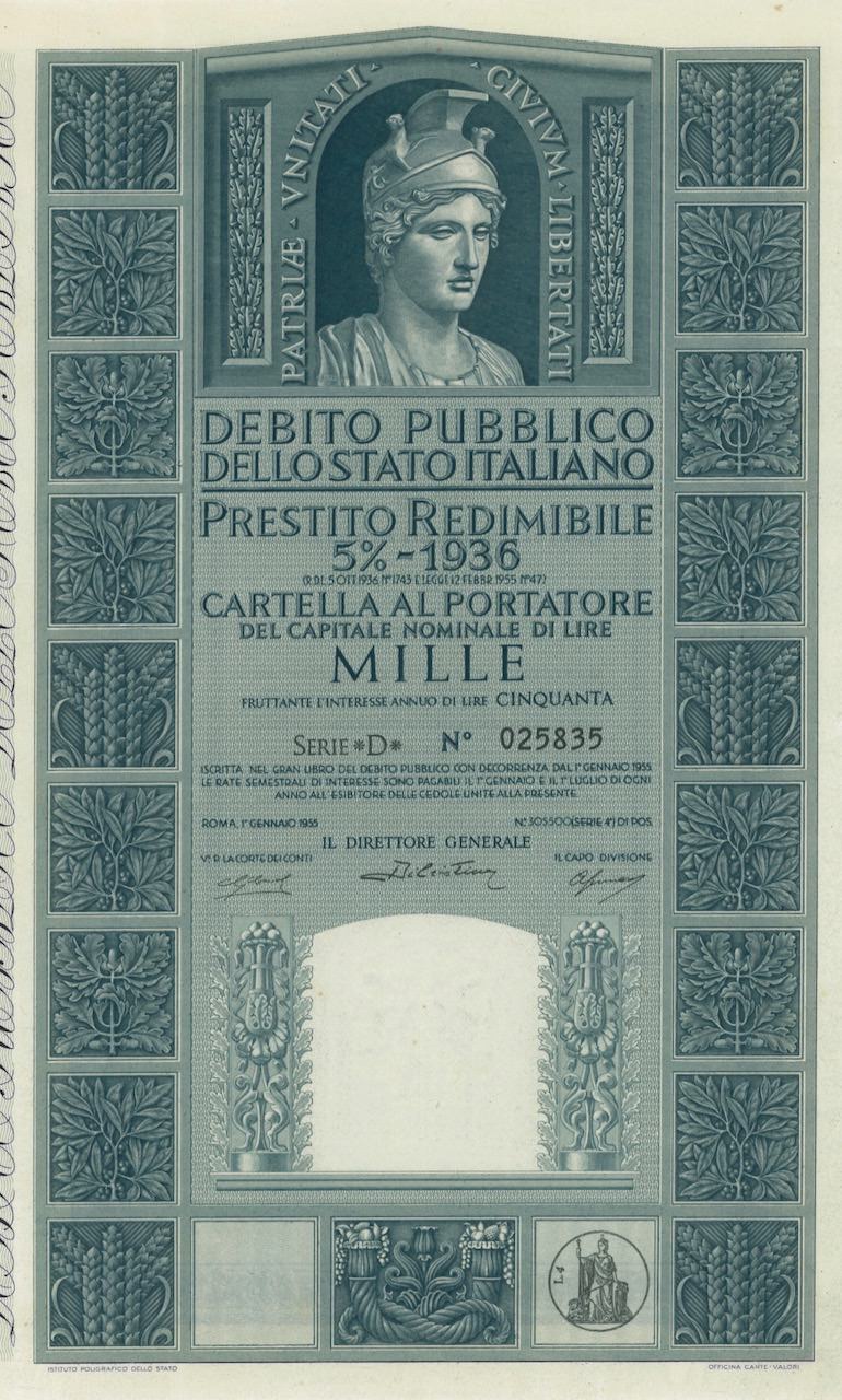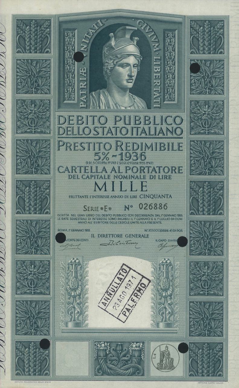 Debito Pubbl. dello Stato Italiano – Prestito Redim. 5% – 1936 – Cart. al Port.