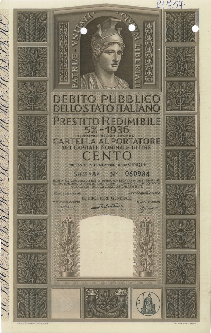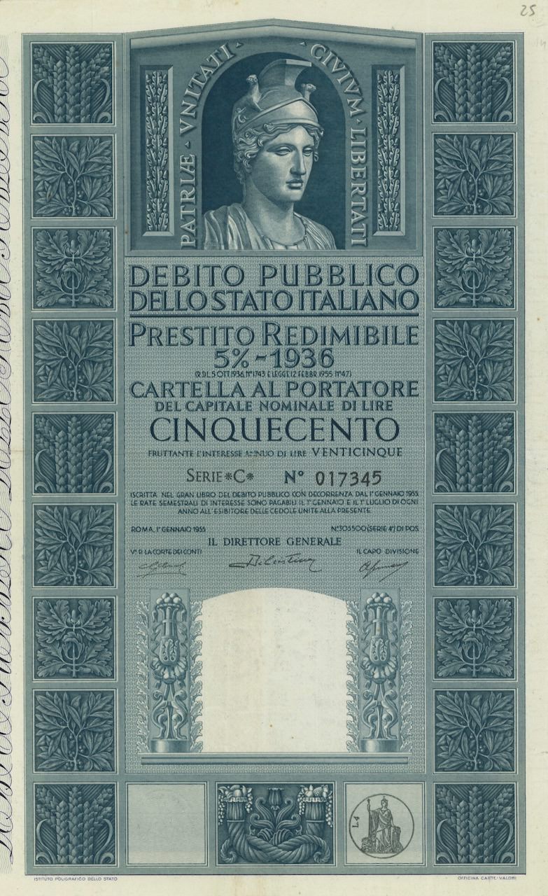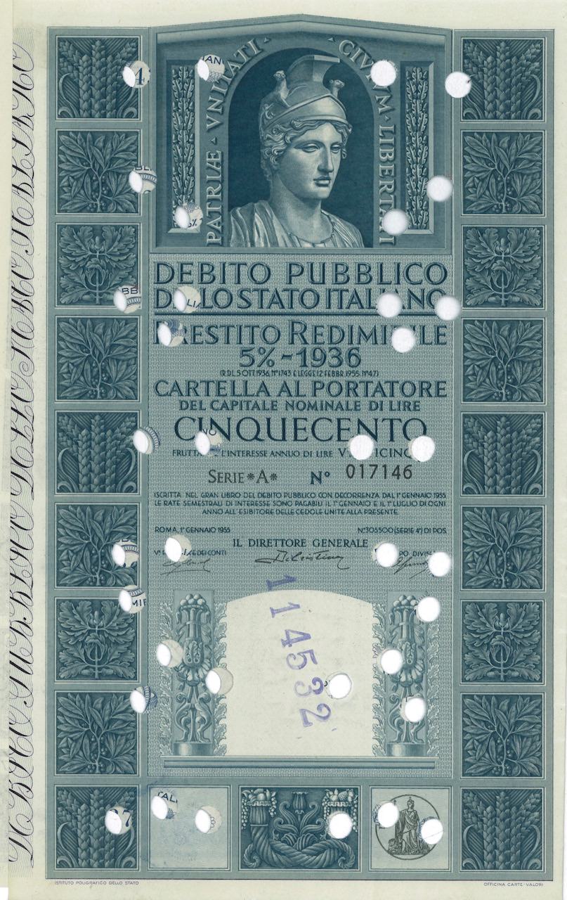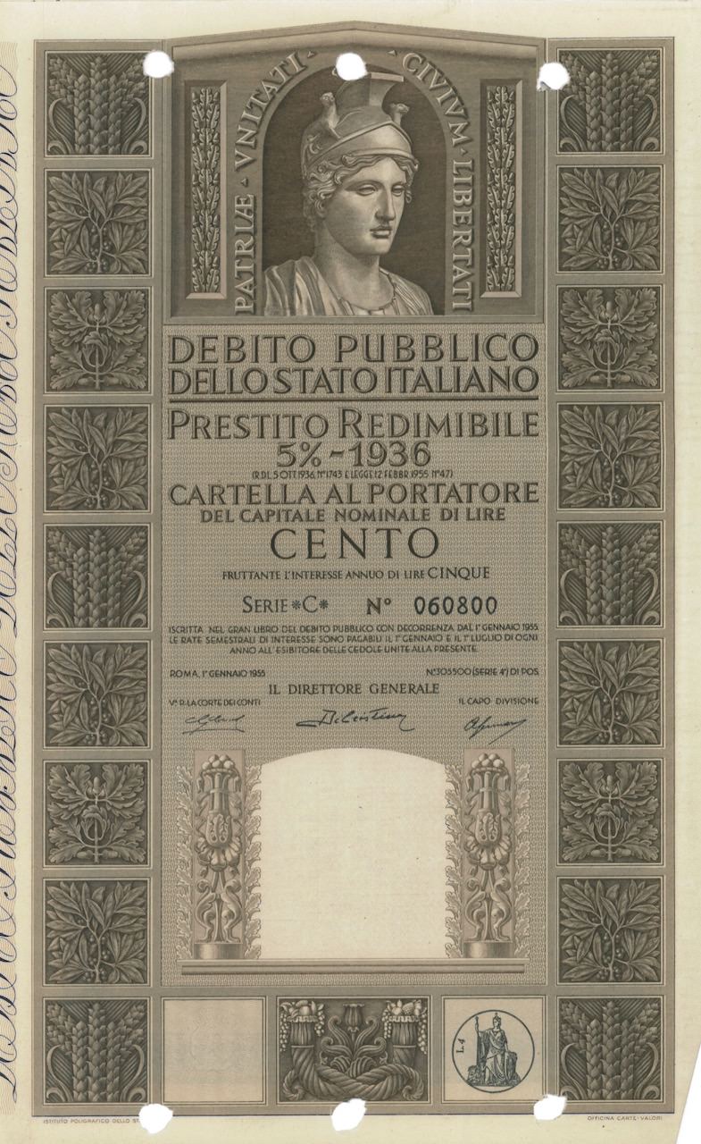 Debito Pubbl. dello Stato Italiano – Prestito Redim. 5% – 1936 – Cart. al Port.