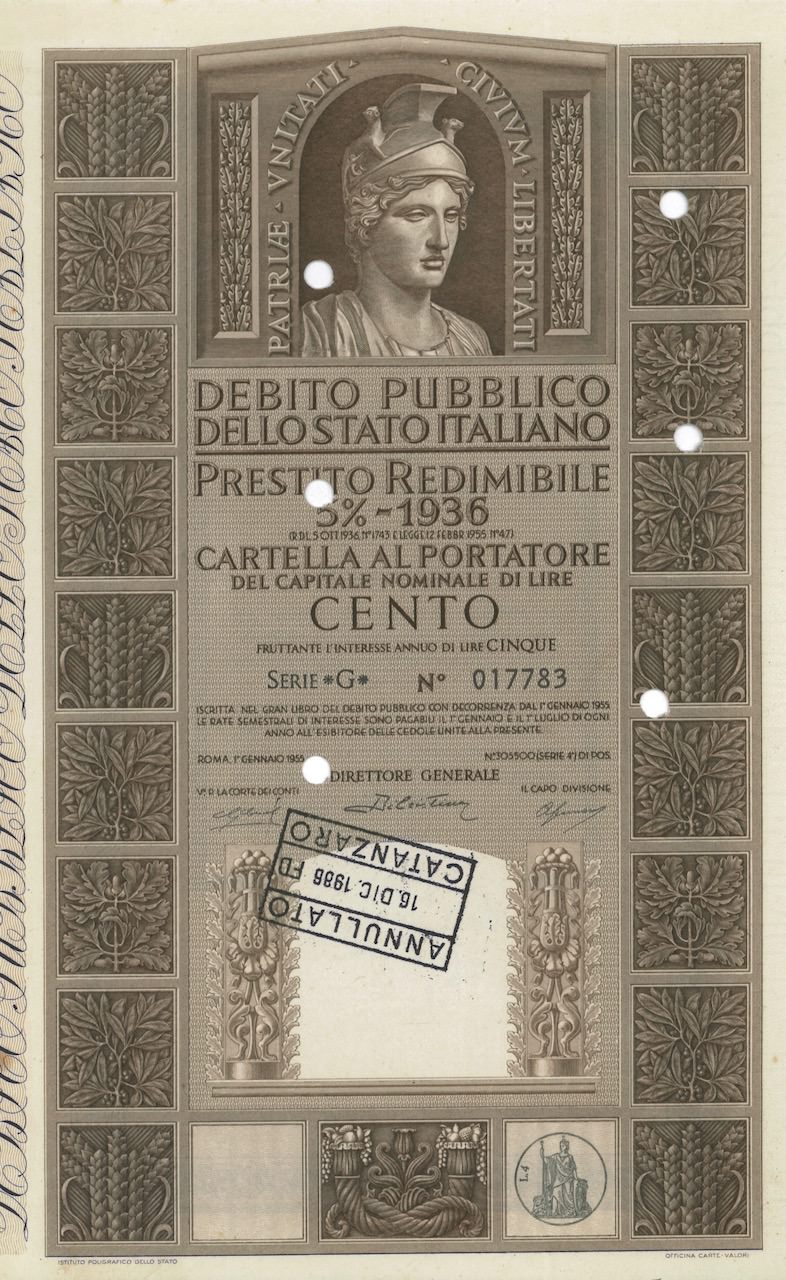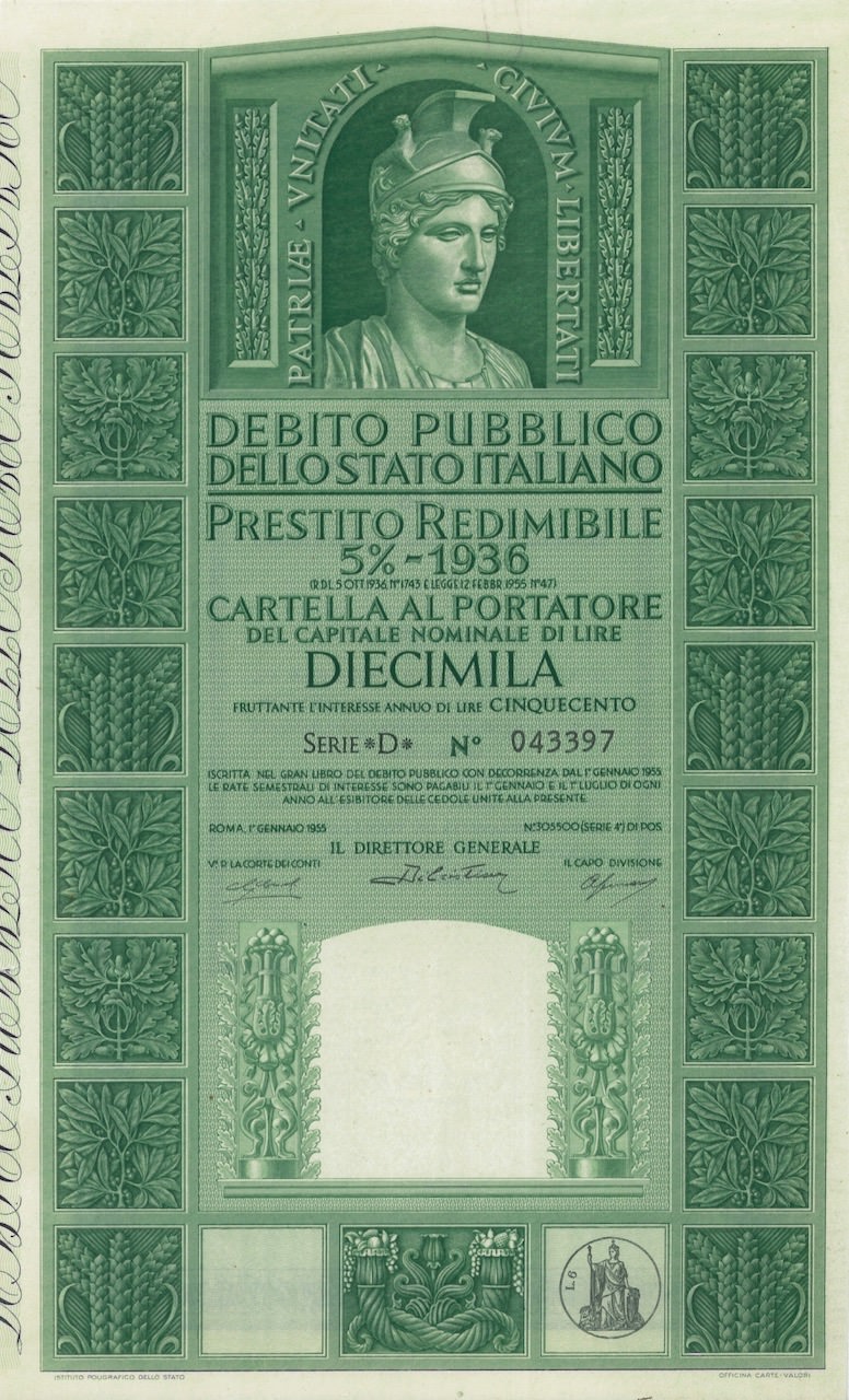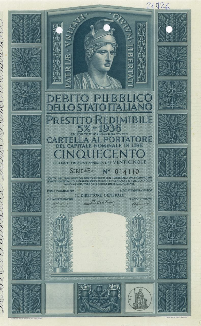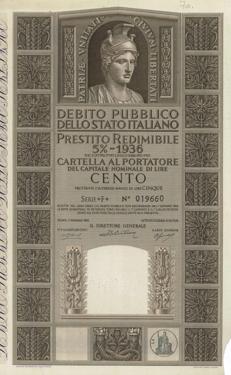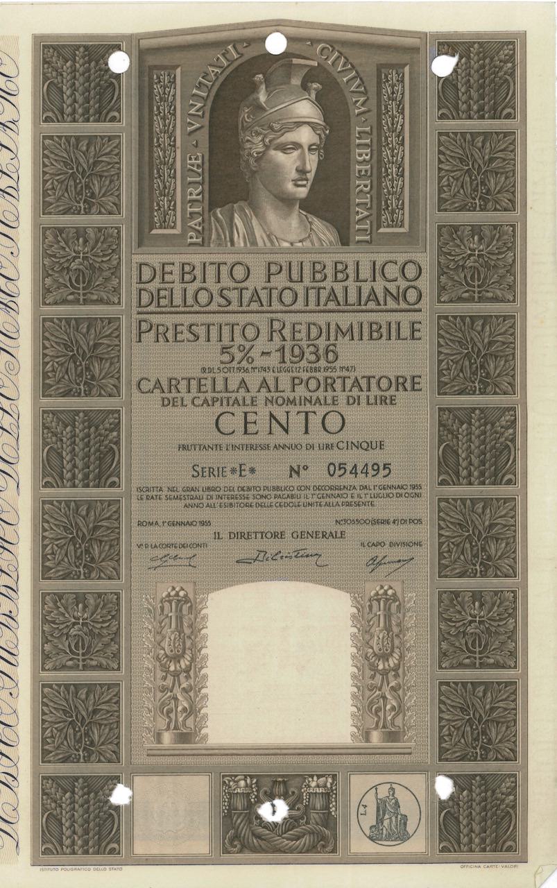 Debito Pubbl. dello Stato Italiano – Prestito Redim. 5% – 1936 – Cart. al Port.