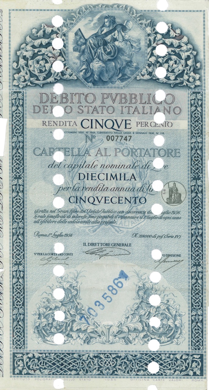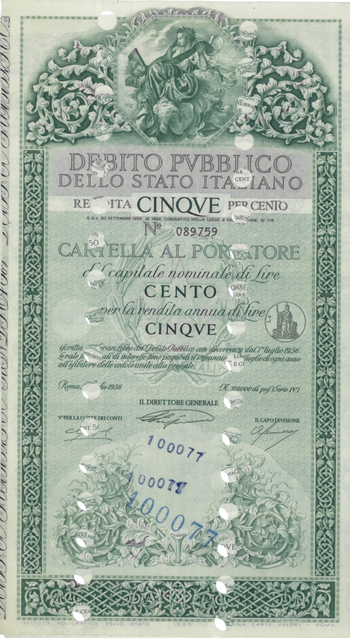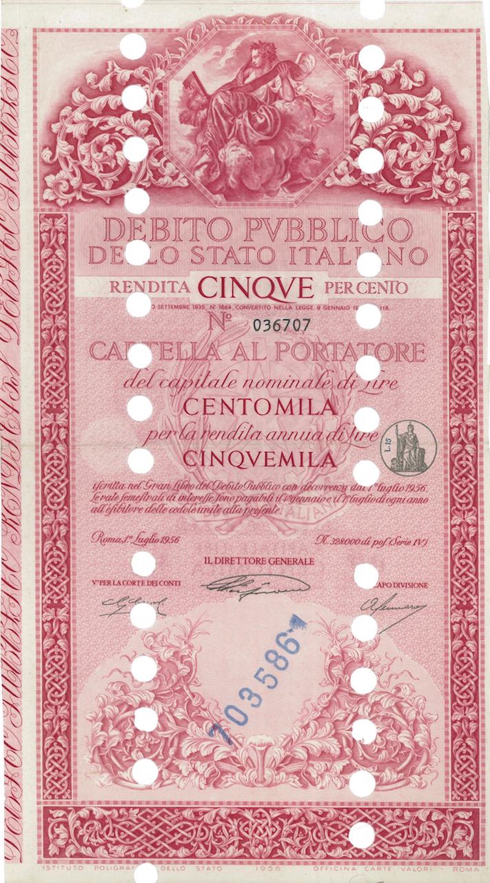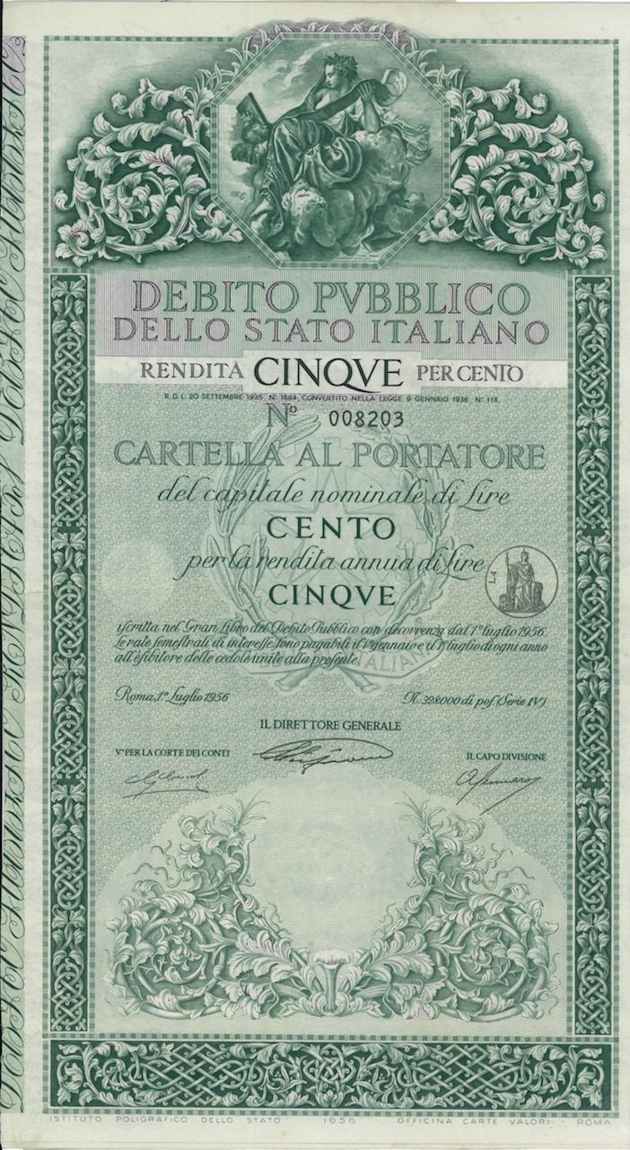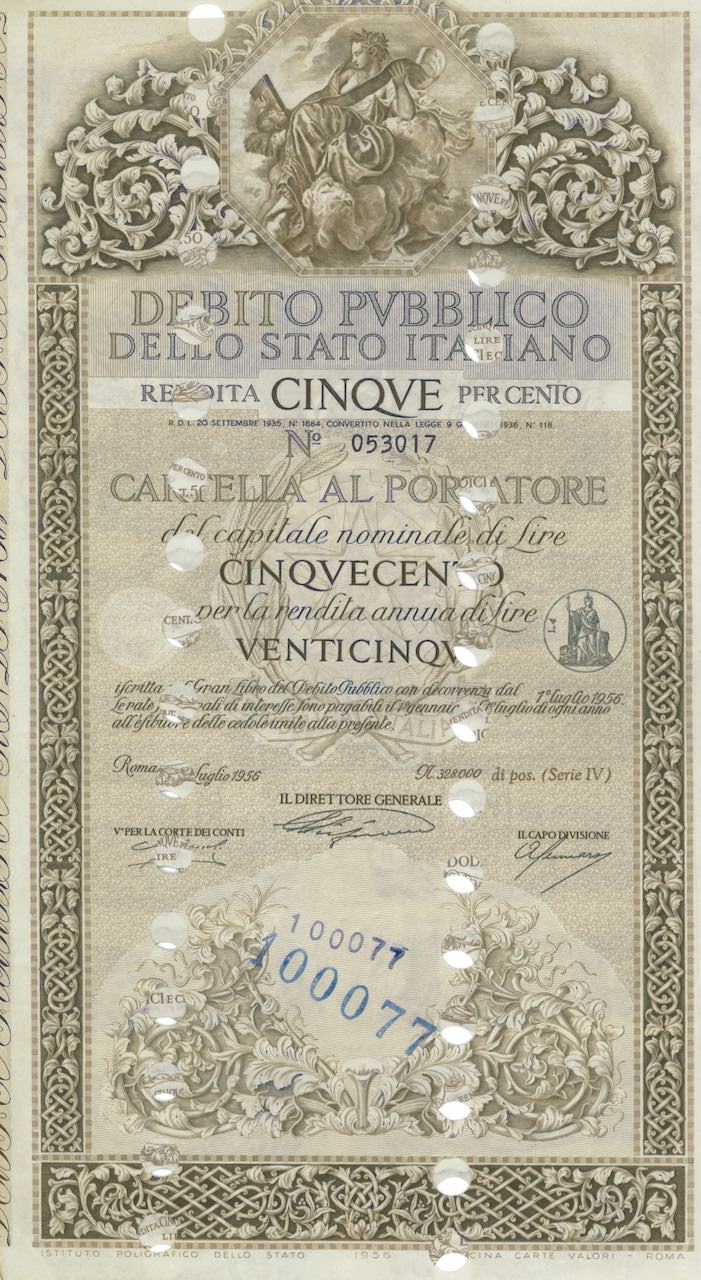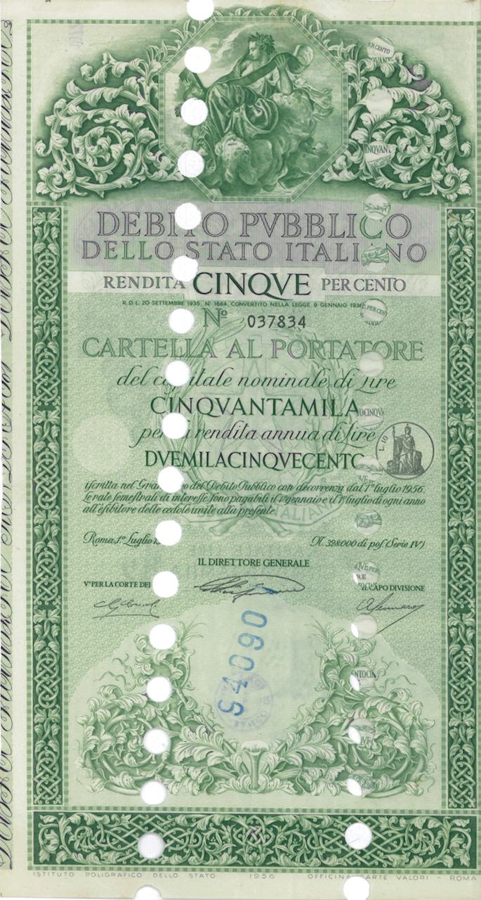 Debito Pubbl. dello Stato Italiano – Rendita 5% – Cartelle al Port. (Anno 1956)