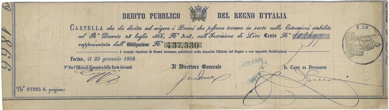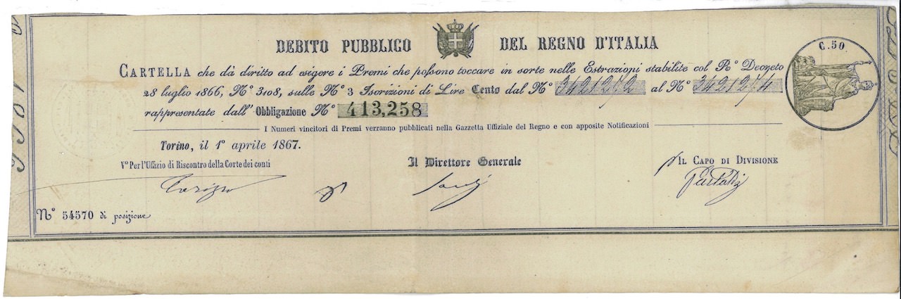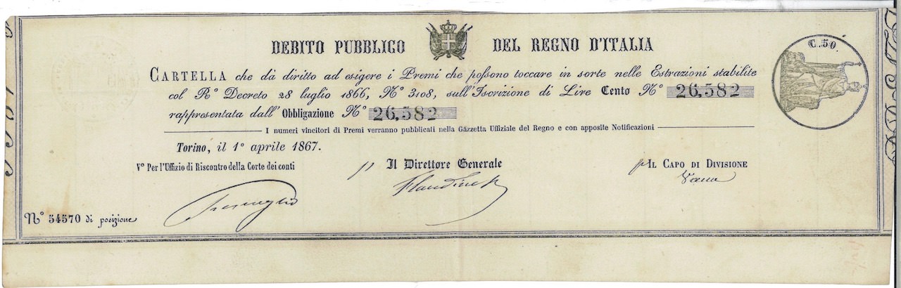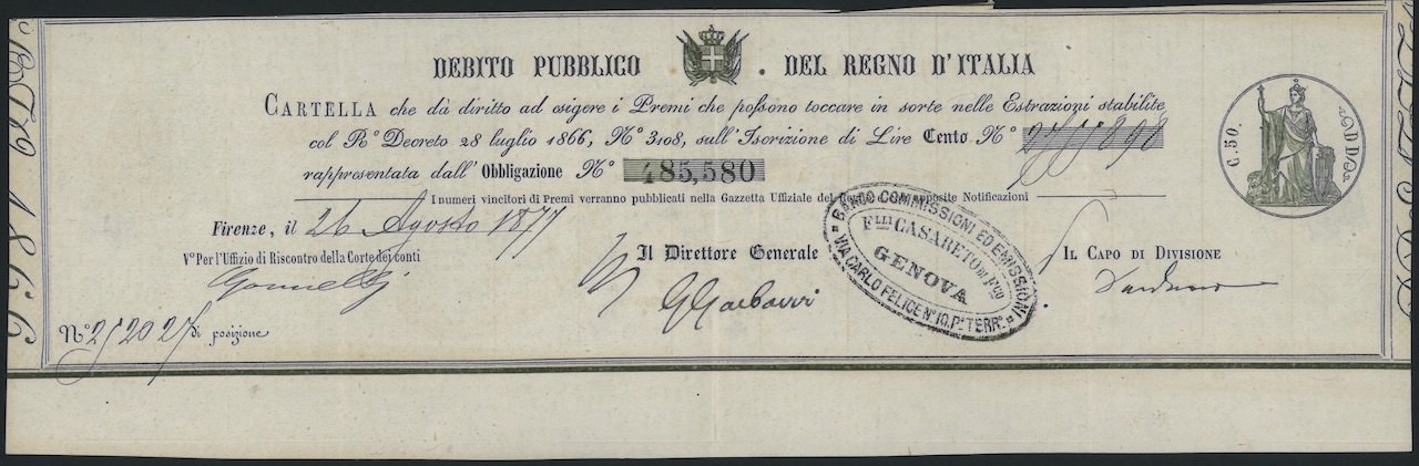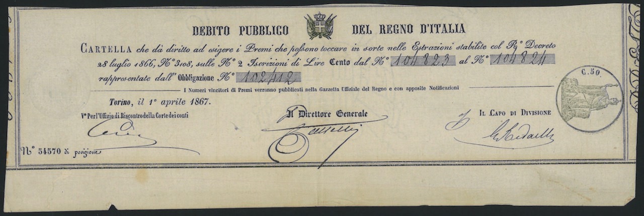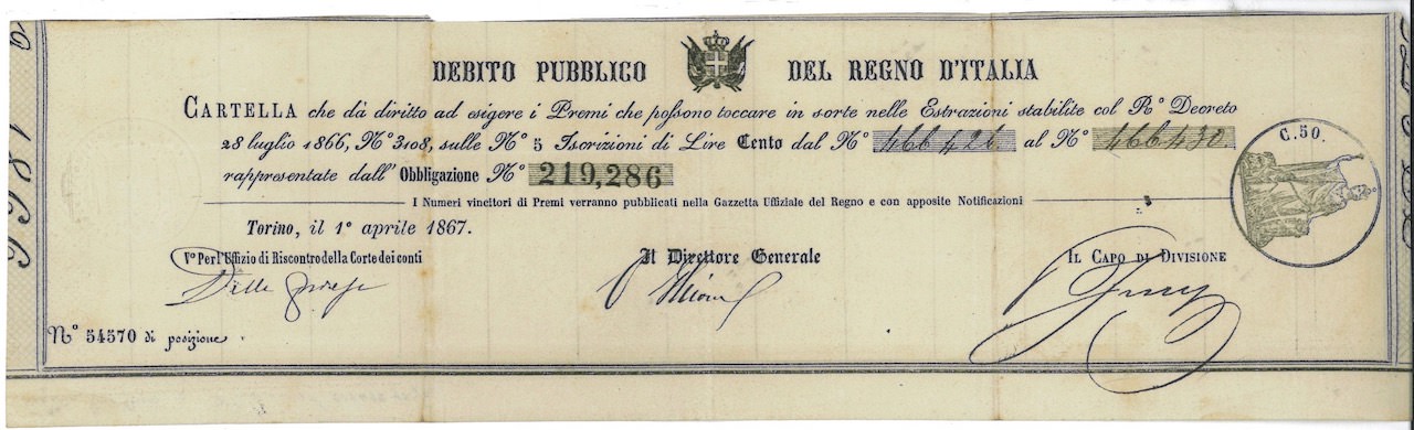 Debito Pubblico del Regno d’Italia – Cartella (R. Decr. 1866)