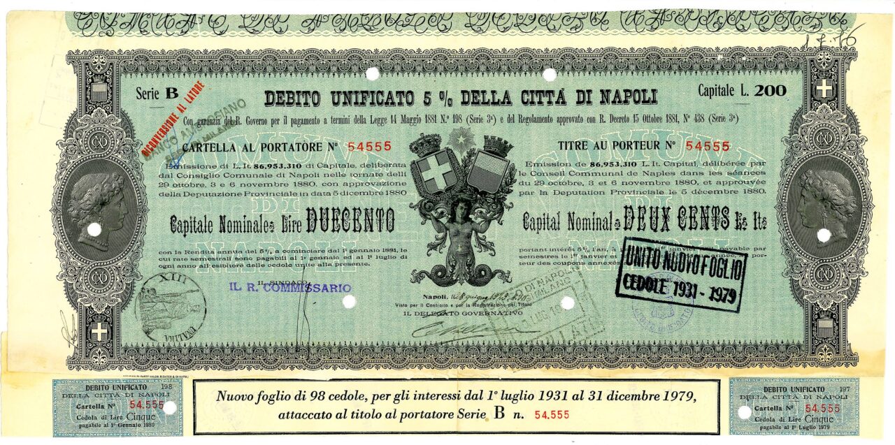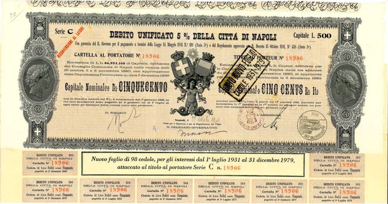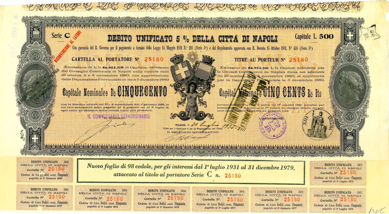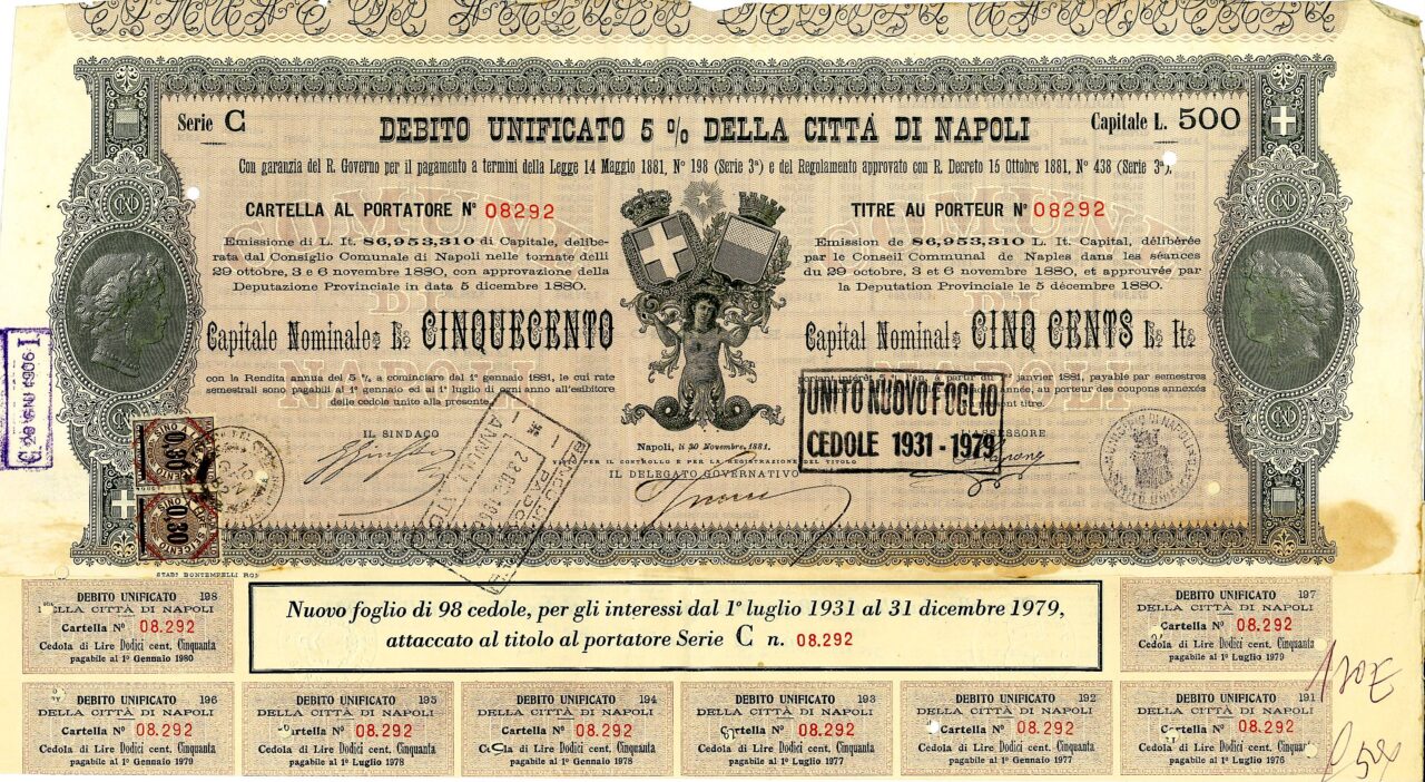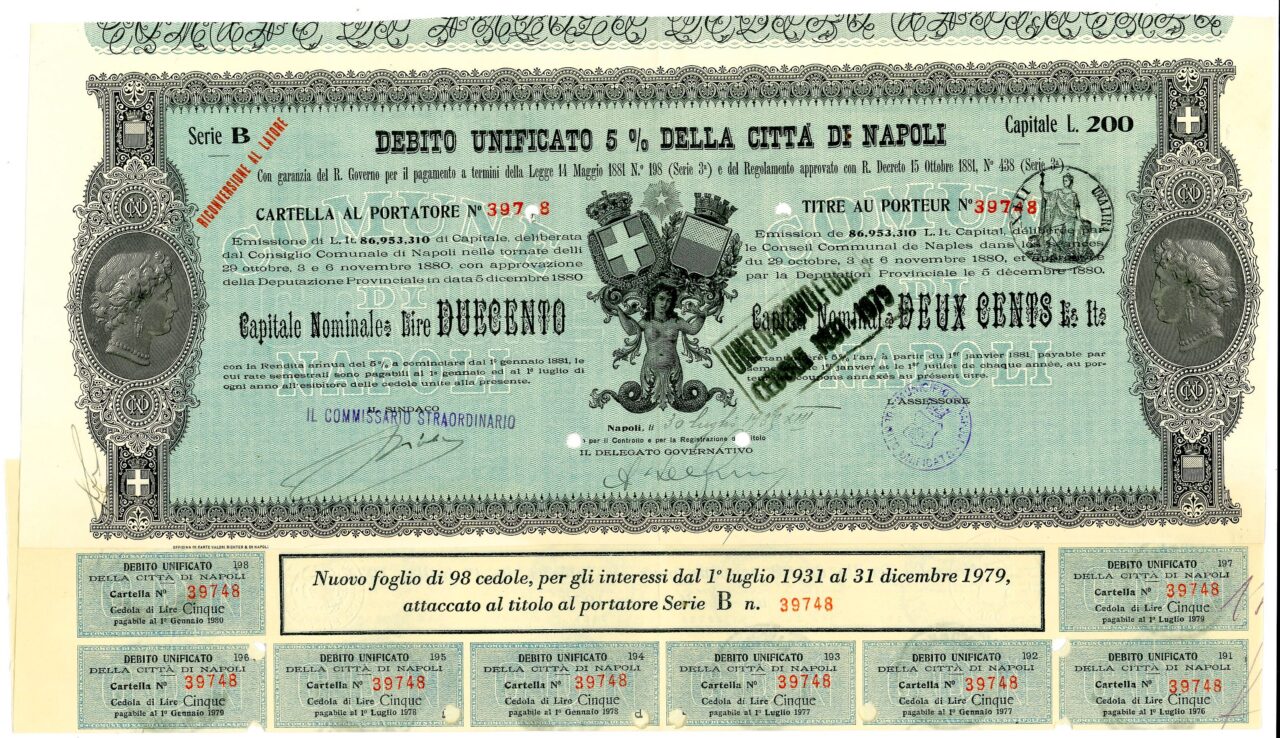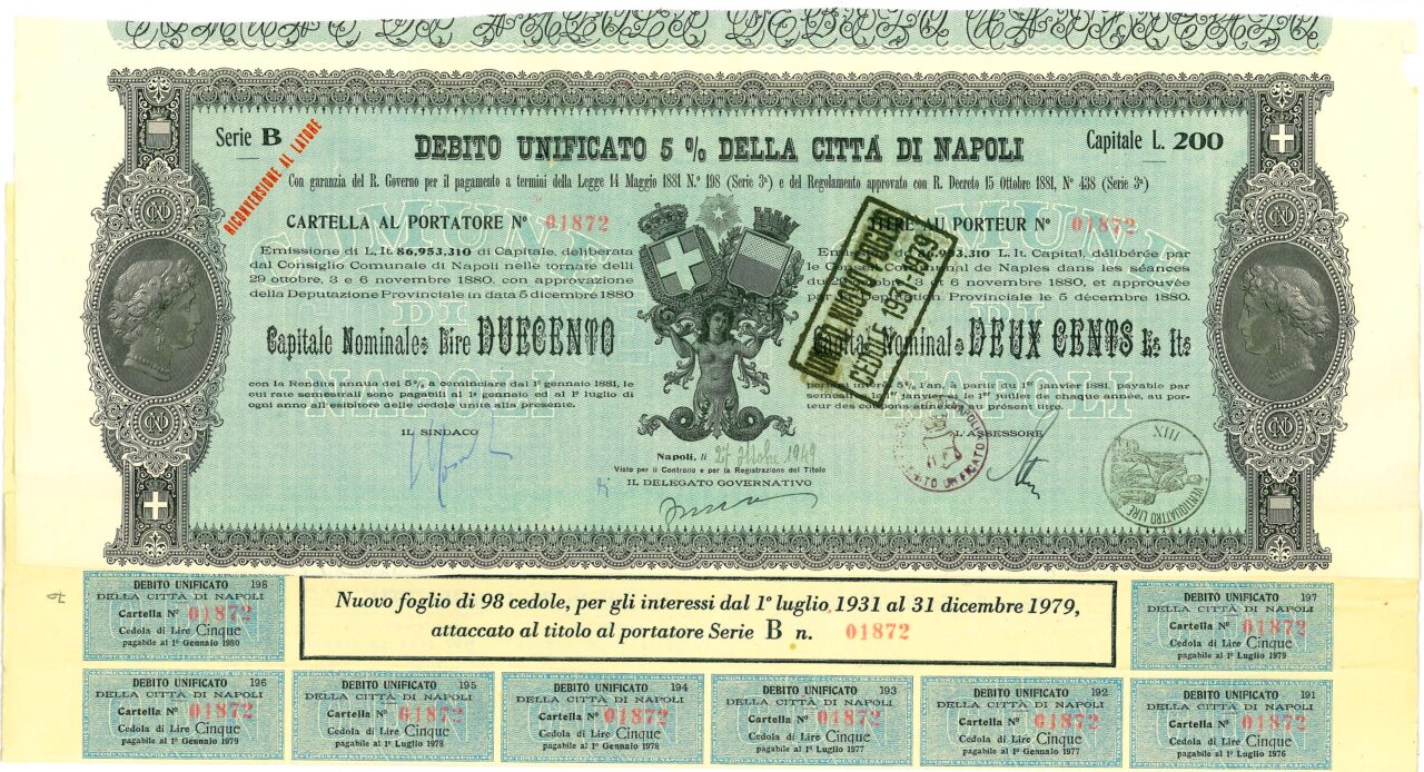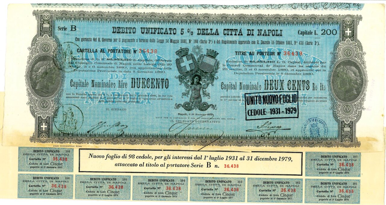 Emissione di L. It. 86,953,310 di Capitale, deliberata dal Consiglio Comunale di Napoli nelle tornate del 29 ottobre, 3 e 6 novembre 1880 con approvazione della Deputazione Provinciale in data 5 dicembre 1880. Capitali Nominativi da 100 / 200 / 500 e 1.000 Lire. Con la Rendita annua del 5% a cominciare dal 1 gennaio 1881, le cui rate semestrali sono pagabili al 1 gennaio ed al 1 luglio di ogni anno all’esibire delle cedole unite alla presente. Riporta le firme in originale del Sindaco, dell’assessore e del Delegato Governativo.