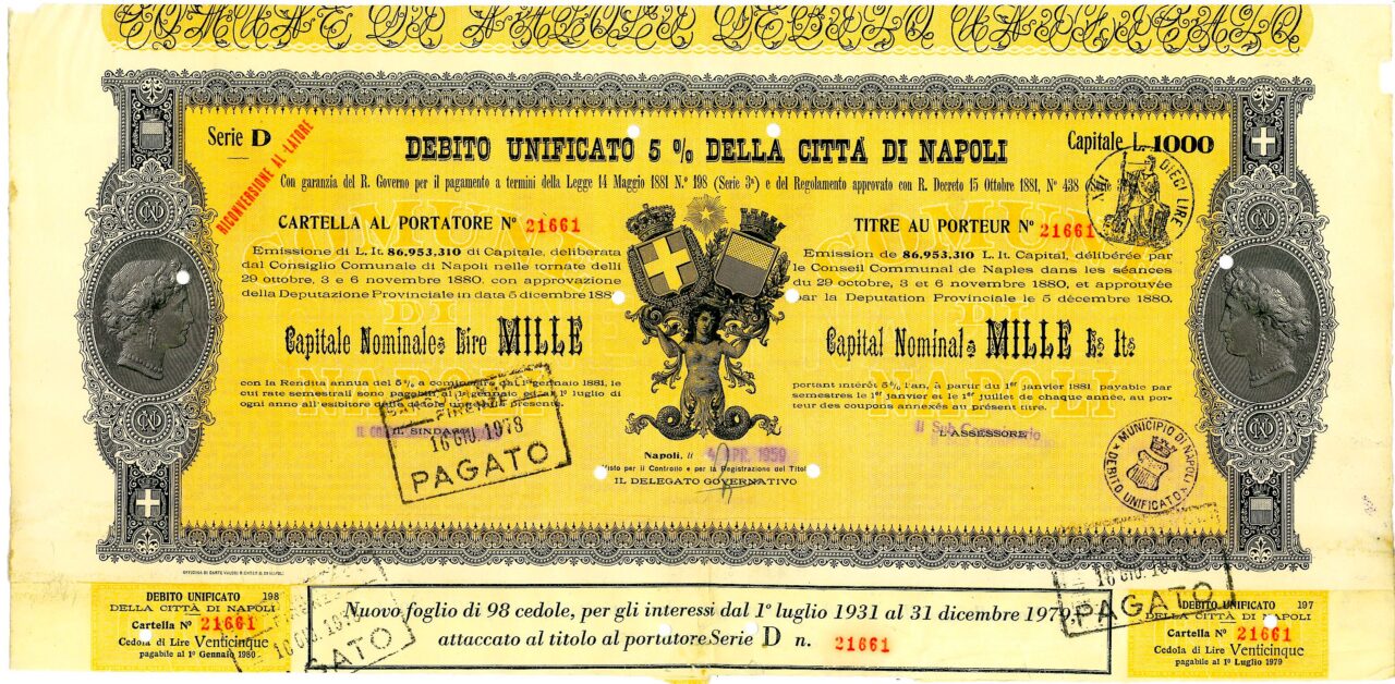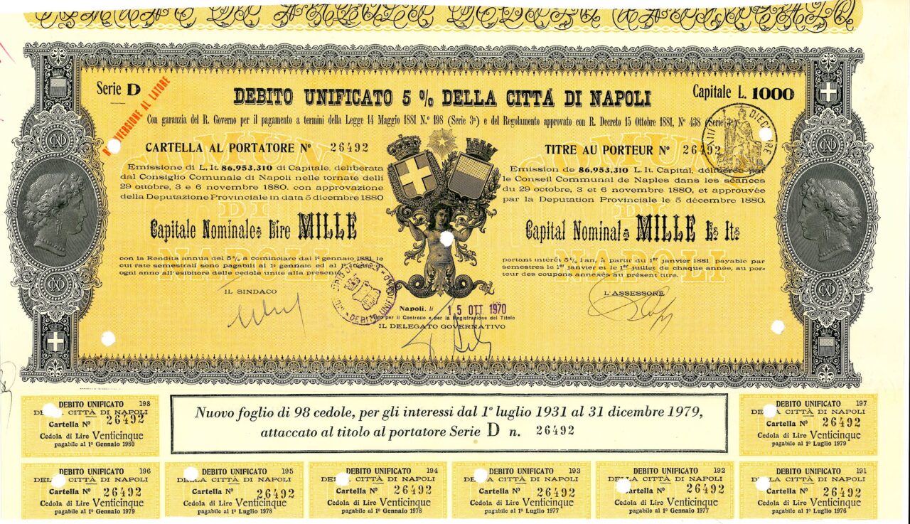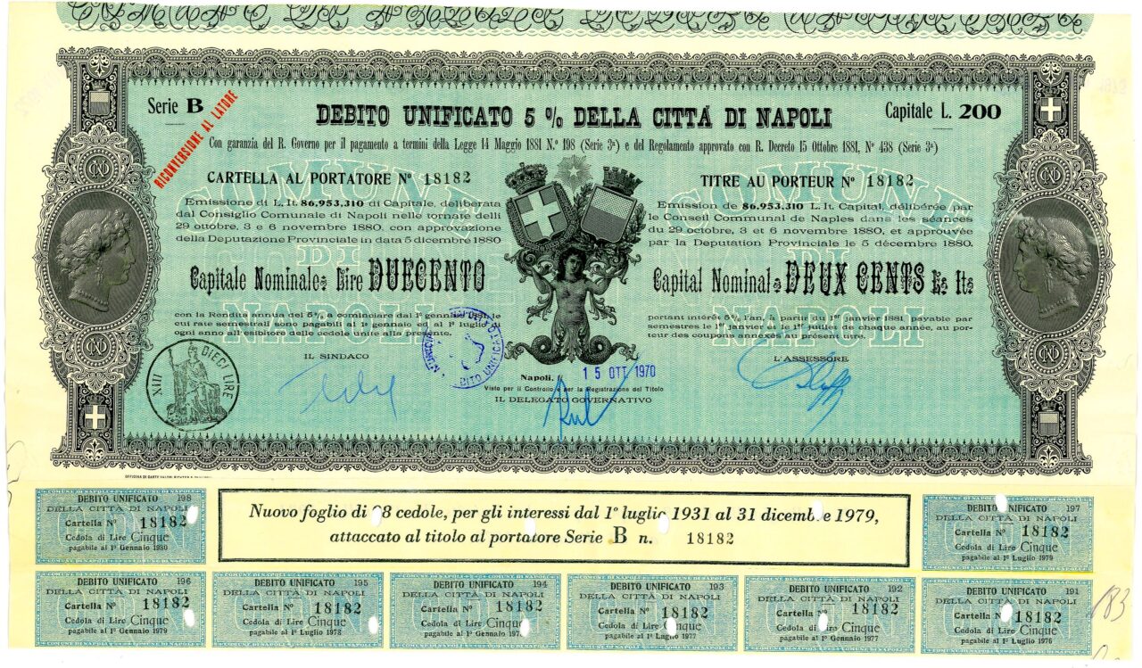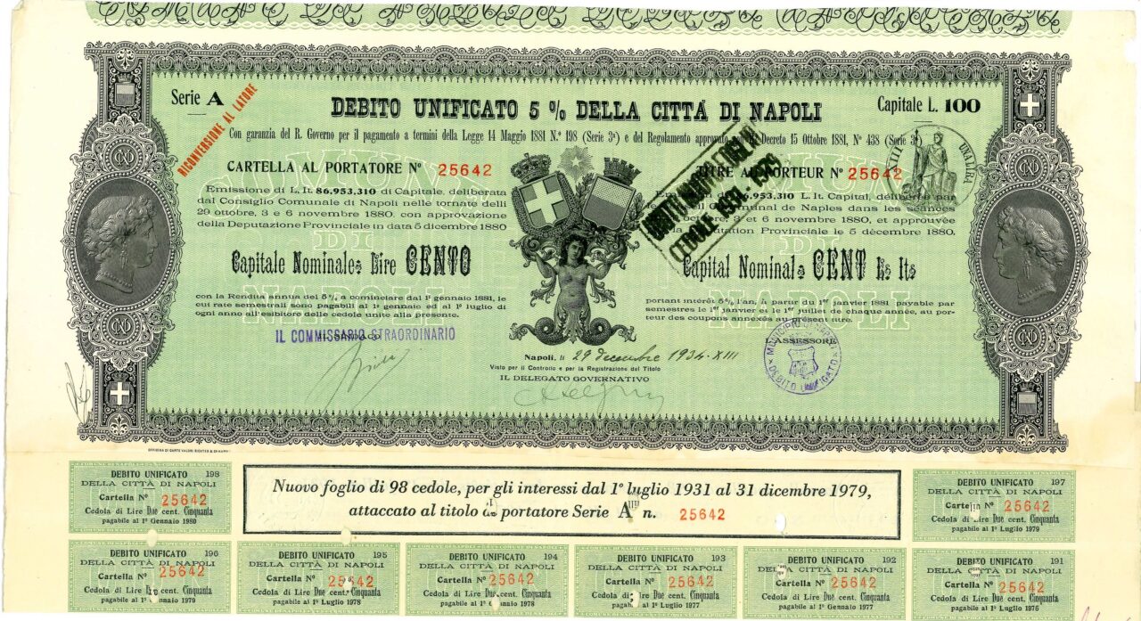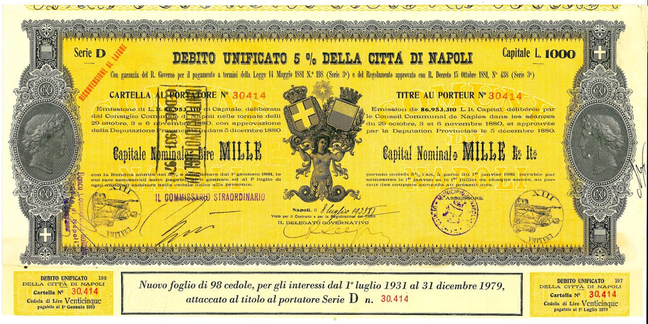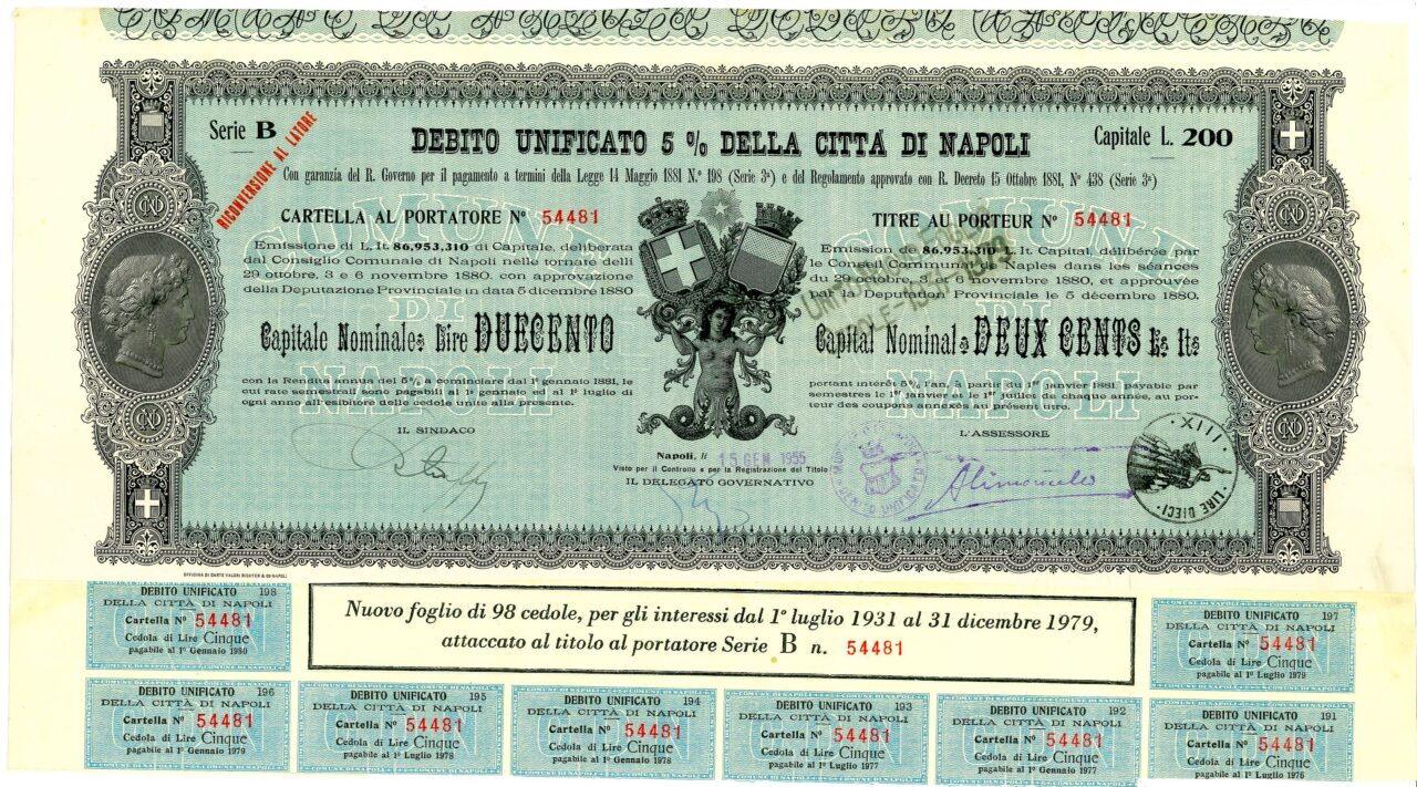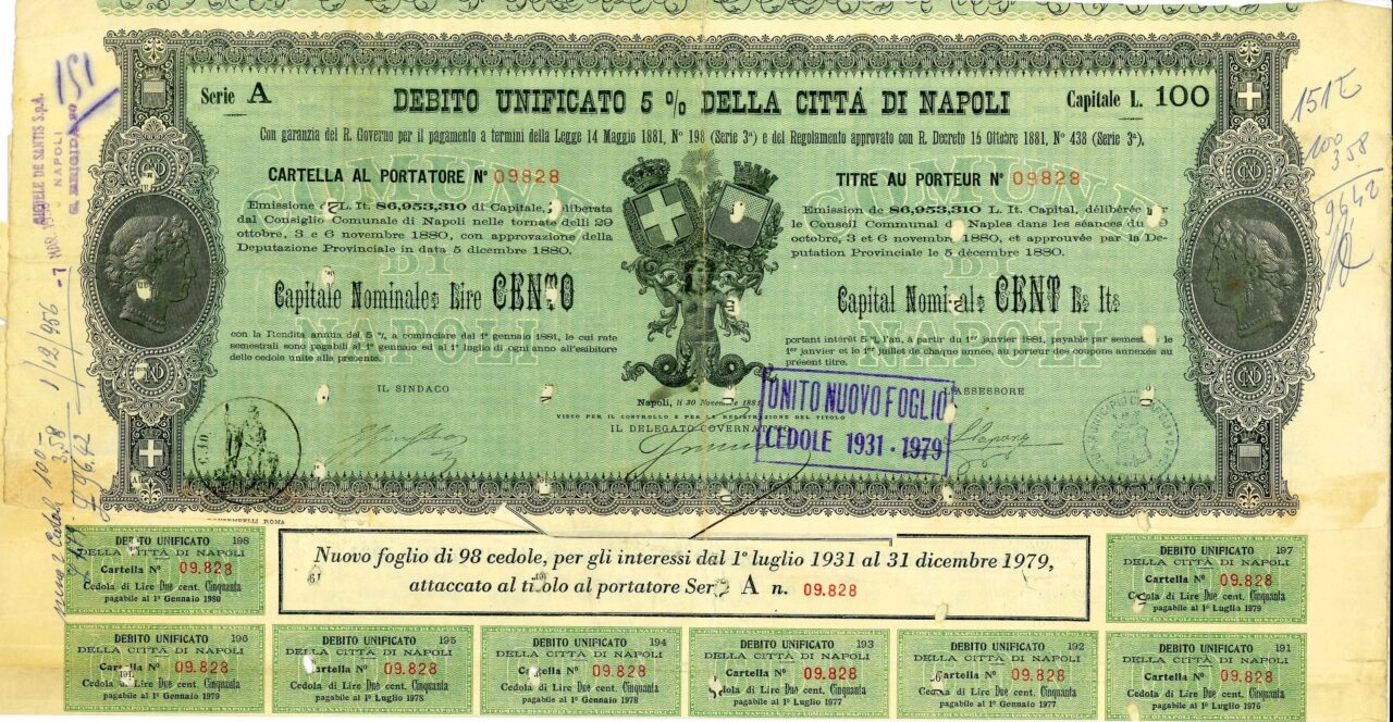 Emissione di L. It. 86,953,310 di Capitale, deliberata dal Consiglio Comunale di Napoli nelle tornate del 29 ottobre, 3 e 6 novembre 1880 con approvazione della Deputazione Provinciale in data 5 dicembre 1880. Capitali Nominativi da 100 / 200 / 500 e 1.000 Lire. Con la Rendita annua del 5% a cominciare dal 1 gennaio 1881, le cui rate semestrali sono pagabili al 1 gennaio ed al 1 luglio di ogni anno all’esibire delle cedole unite alla presente. Riporta le firme in originale del Sindaco, dell’assessore e del Delegato Governativo.