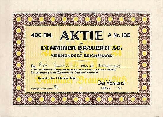 A-66344Demminer Brauerei AG-1Demmin19391 azione nominativa da 400 Marchi--
