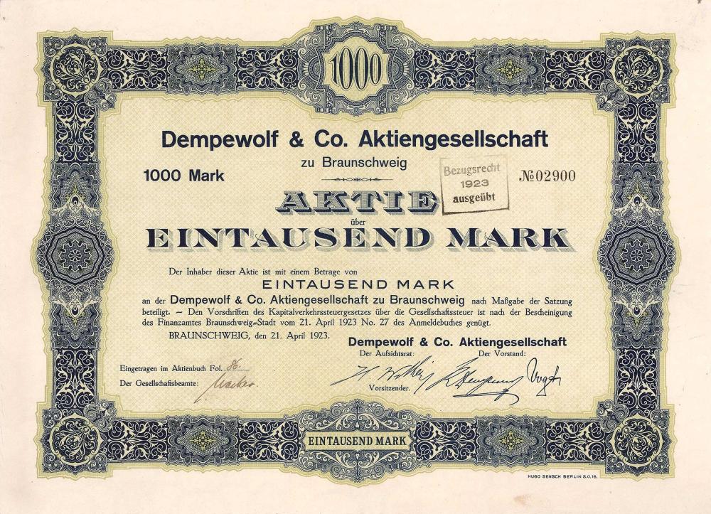 Fondata nell’aprile 1923 da Carl Dempewolf, il produttore di Solingen Gustav Grah e la banca privata Braunschweig J. Wertheim. Scopo dell’azienda: produzione di acciaio e metalli pregiati, nonché esportazione e importazione di prodotti chimici, macchine e prodotti finiti di ogni tipo: nell’agosto del 1924 fallì. Secondo la notifica dell’amministratore fallimentare Dipl.-Buchrevisor A. Huss, Braunschweig, dal 13 luglio 1925, era disponibile una proprietà fallimentare di 12.000 RM, che doveva essere distribuita.