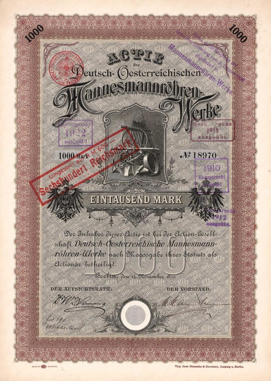 La famiglia Mannesmann possedeva stabilimenti a Remscheid, Komotau e Bous. Padre (Reinhard) e figli (Reinhard jr. E Max) hanno inventato un processo per la produzione di tubi di acciaio senza saldatura, che sono stati laminati da un blocco di acciaio utilizzando il metodo a gradini inclinati. Il processo è stato padroneggiato in modo più intuitivo, una spiegazione teorica della natura fisica del processo di laminazione è stata trovata solo 40 anni dopo. Di conseguenza, anche questa procedura ha avuto i suoi problemi iniziali. La seguente storia è stata tramandata dal 1893: il banchiere Carl Fürstenberg (Berliner Handels-Gesellschaft) ha visitato la fabbrica Mannesmann a Komotau. Si è perso durante una passeggiata mattutina e finalmente è arrivato in un grande magazzino all’aperto con gli scarti. Quando gli è stato chiesto dove fosse qui, gli è stato risposto da un operaio: “Oh, quello è solo il nostro cimitero”. Come si è scoperto, l’enorme mucchio di rottami è stato valutato come un prodotto semilavorato in bilancio. Ora c’erano guai: le banche, soprattutto BHG e Deutsche Bank, insistevano per una rivalutazione dei brevetti, una restituzione delle quote da parte degli inventori, la nomina di un direttore commerciale e una restrizione dell’operazione di prova. Anche i fratelli Mannesmann erano infastiditi per questo, soprattutto per la sfiducia che avevano espresso, e presto passarono dal consiglio di amministrazione al consiglio di sorveglianza dell’azienda, solo per andarsene dopo alcuni anni di conflitto. Ci furono controversie legali, ma alla fine fu raggiunto un accordo amichevole, in base al quale la famiglia Mannesmann dovette rinunciare a una parte significativa della loro partecipazione. Precedentemente uno dei più grandi gruppi tedeschi nella costruzione di impianti, produzione di tubi, commercio e, più recentemente, telecomunicazioni. Inghiottito dalla britannica Vodafone dopo un’enorme battaglia di acquisizione nel 2000.