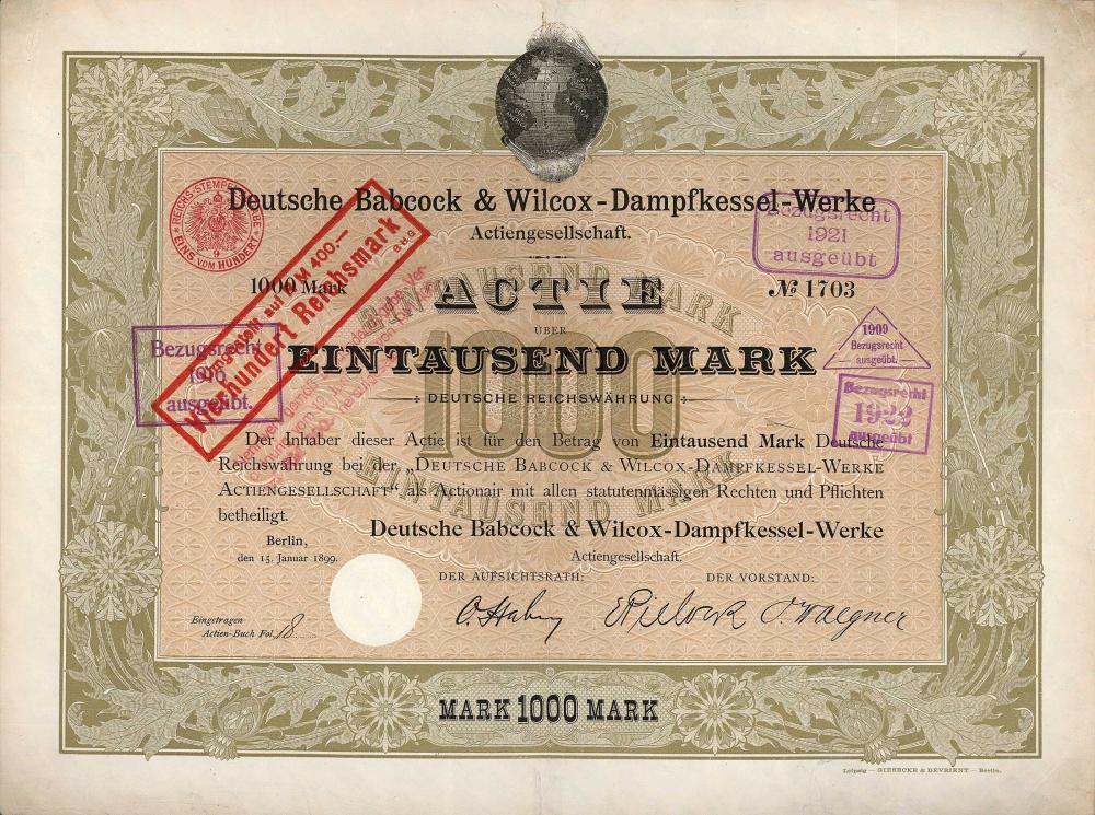 A-74314Deutsche Babcock & Wilcox-Dampfkessel-Werke-1Berlino18991 azione da 1.000 MarchiR5 (101-250 pezzi)S6 (da 501 a 1.000 €)