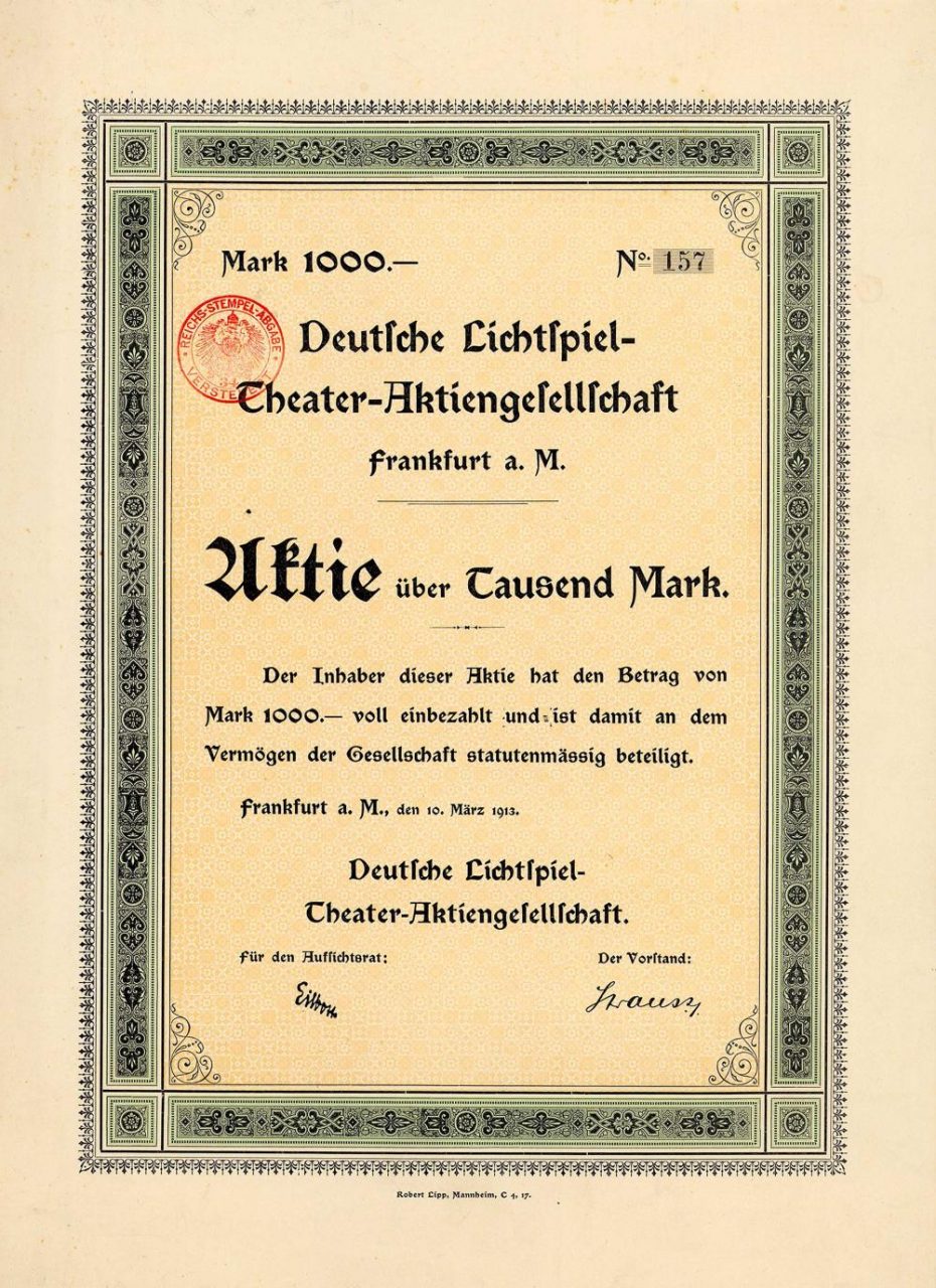 Fondata il 19 dicembre 1912, registrata il 6 gennaio 1913. Il 14 luglio 1913 fu aperta la procedura fallimentare contro i beni della società. Lo scopo della società era la creazione e il funzionamento di sale cinematografiche, nonché la distribuzione di apparecchi e film. Dopo la distribuzione dei beni rimanenti, la procedura fallimentare fu revocata il 15 luglio 1914.