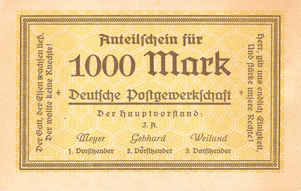 A-63524Deutsche Postgewerkschaft-1Monaco19231 azione da 1.000 MarchiR4 (251-500 pezzi)S4 (da 101 a 250 €)