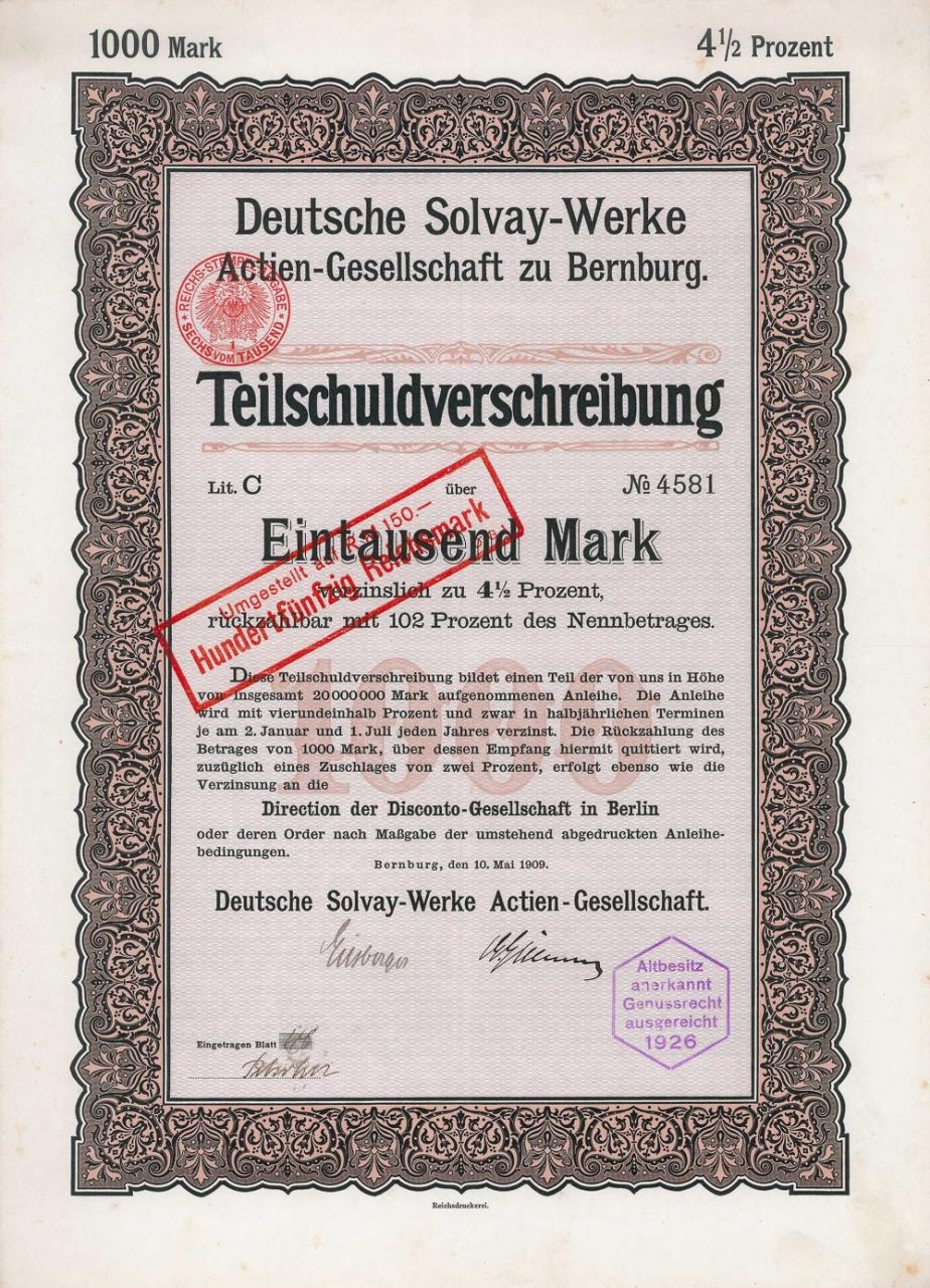 Fondata nel 1885, rileva le filiali tedesche di KG Solvay & Cie. a Bruxelles (fabbriche di soda a Wyhlen, Bernburg, Saaralben, Salisburgo, fabbrica di elettroliti Osternienburg), così come la miniera di sali di roccia e di potassio Solvayhall vicino a Bernburg e diverse miniere di lignite. Nel 1939 lo stabilimento di Bernburg fu posto sotto la supervisione nazista e un anno dopo sotto l’amministrazione forzata. Nel 1948 l’azienda si trasferisce da Bernburg a Solingen. Dopo la fine della guerra, la produzione di soda fu ripresa a Bernburg nel 1952 come “azienda statale” della DDR. Nel 1991 lo stabilimento è stato reintegrato nel Gruppo Solvay. Solvay è uno dei maggiori investitori nell’industria chimica della Sassonia-Anhalt.