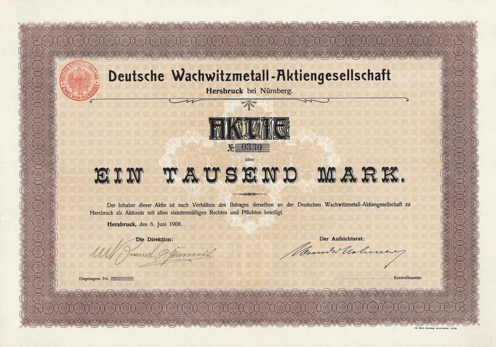 Quando la AG fu fondata a Norimberga nel luglio 1900, i donatori non avevano idea di cosa sarebbe successo. La storia dell'azienda sembra una storia raccapricciante dal Neuer Markt: Heinrich Wachwitz aveva ottenuto brevetti imperiali per prodotti metallici in acciaio-alluminio, il cui valore di contributo era di 1 milione di marchi quando fu fondata l'AG - questa era la prima metà del capitale azionario di 2 milioni di marchi. Il famoso banchiere Dünkelsbühler ha sottoscritto la seconda metà, ma ha pagato le azioni solo al 30%. Tuttavia, l'alta tecnologia brevettata acciaio-alluminio non ha funzionato correttamente e anche la mancanza cronica di denaro ha ostacolato la produzione. Ora la Wachwitz Society aveva stretti rapporti commerciali con Alexanderwerk A... Altro