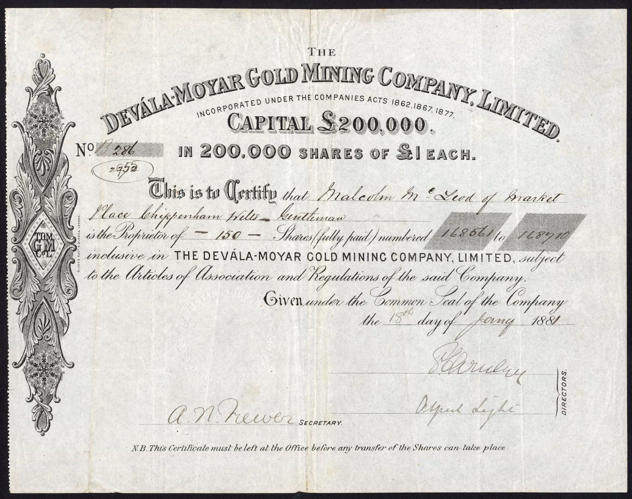 A-39738Devala-Moyar Gold Mining Company, Ltd-1India1881£1 SharesR2 (1001-5000 pezzi)S2 (da 26 a 50 €)