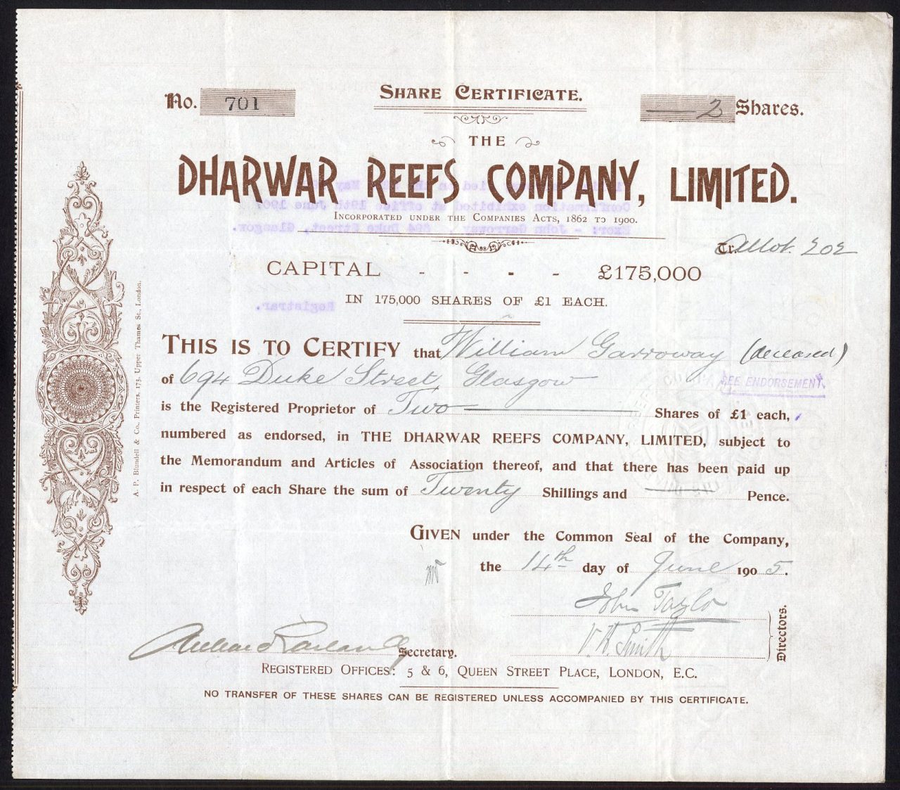 Capitale £ 175.000 in azioni di £ 1. Aumentato a £ 235.000 intorno al 1908.