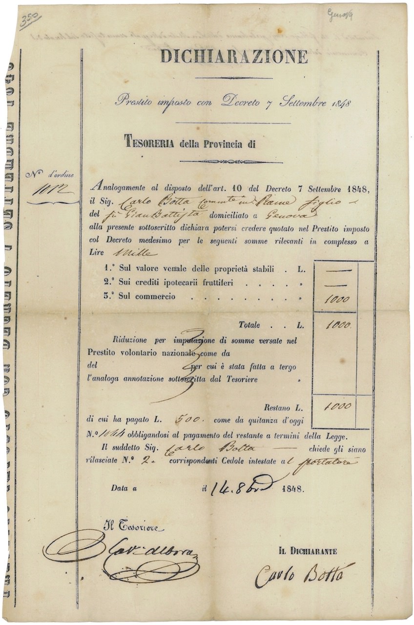 Dichiarazione Prestito Imposto Decreto 7 Settembre 1848