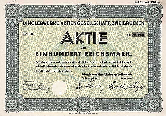 Fondata nel 1827, AG dal 1897 come “Dingler’sche Maschinenfabrik AG”. Programma di produzione degli stabilimenti di Zweibrücken e Bierbach: attrezzature per lavori siderurgici, raccordi, serbatoi, edifici per reattori nucleari, macchine per costruzioni stradali. Il principale azionista era (Mannesmann-) Demag, quotata alla Borsa di Francoforte.