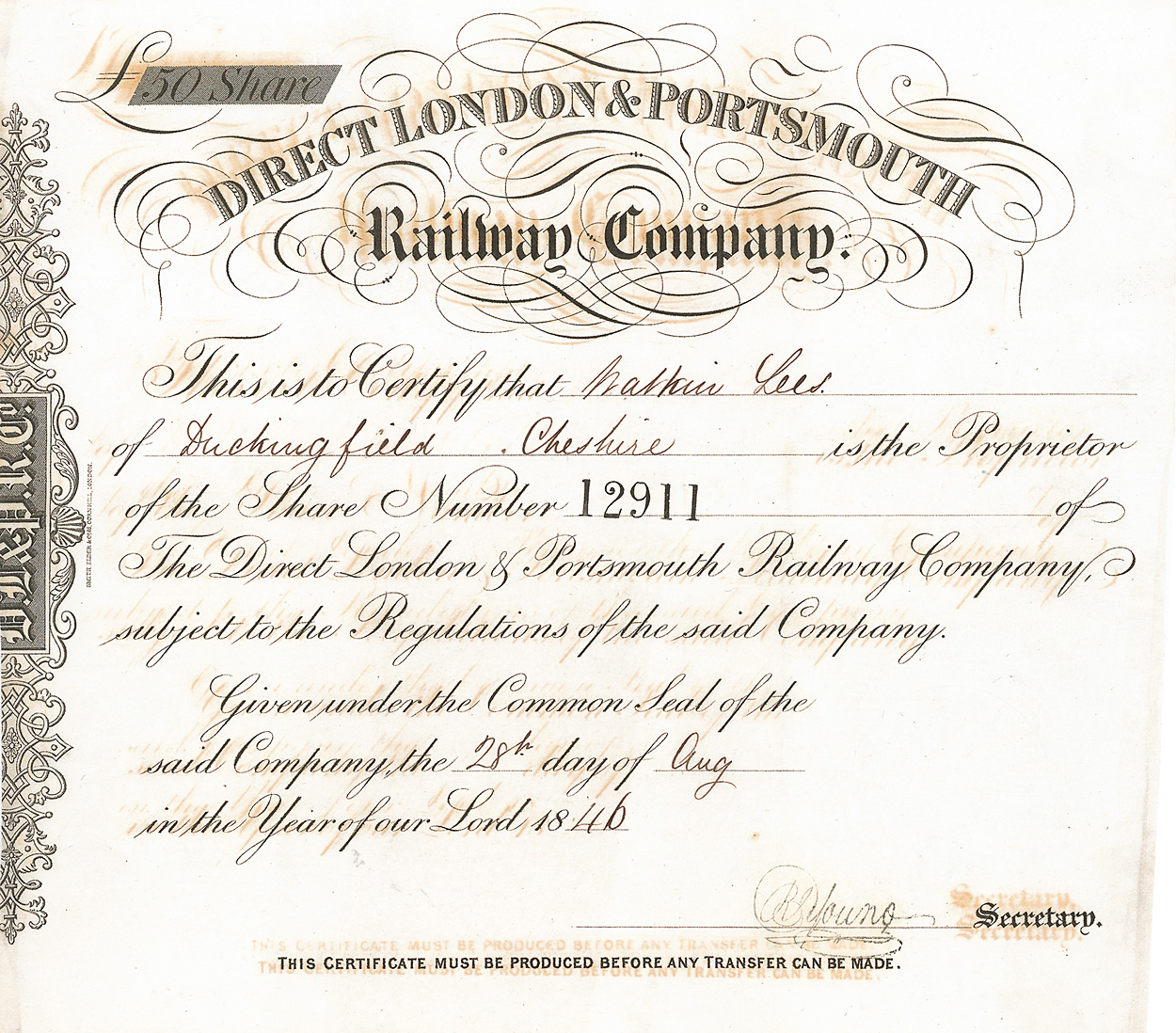 La Railway Company, fondata nel 1845, fu autorizzata dal Parlamento nel 1846 a costruire una ferrovia atmosferica da Epson a Dorking passando per Godalming, Havant e Portsmouth. Il sistema ferroviario atmosferico alimentato ad aria compressa fu diffuso da Isambard Kingdom Brunel. L'eminente ingegnere britannico divenne famoso soprattutto per la costruzione della Great Western Railway e di una serie di famosi piroscafi (tra cui il Great Western, il Great Britain e il Great Eastern). Un documento estremamente raro dei tempi pionieristici della ferrovia che documenta una tecnologia dimenticata.
