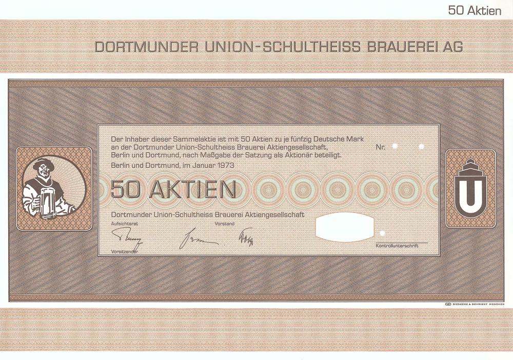 Nel 1972 vi fu la fusione della Dortmund Union-Brauerei AG (fondata nel 1873) e della Schultheiss-Brauerei AG, Berlino (fondata nel 1842). La fusione iniziò a diventare il più grande gruppo di bevande tedesco, ribattezzato Brau und Brunnen AG nel 1998.