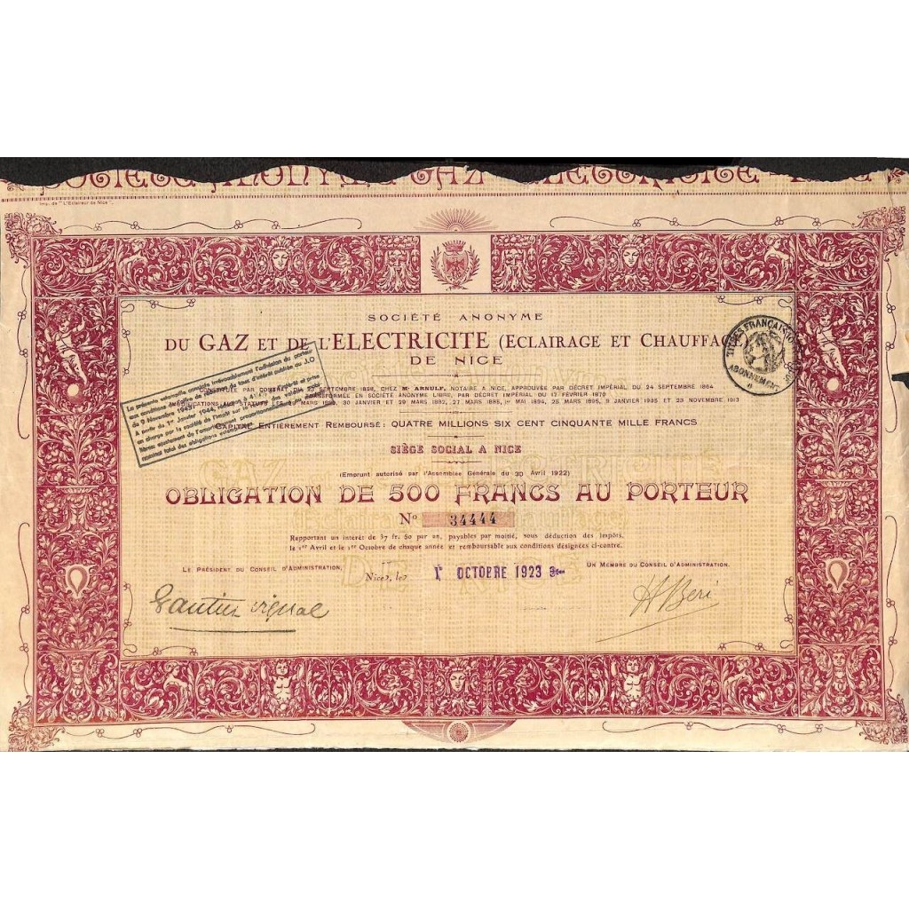 A-49773Du gaz et de l’electricite de nice soc. Anon.-1 Nizza1923500 FranchiR1 (Più di 5000 pezzi)S1 (da 0 a 25 €)