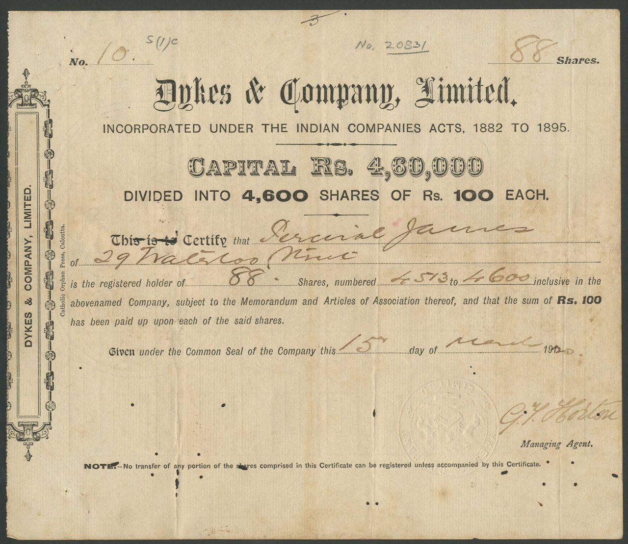 Capitale 4,60.000 in 4.600 azioni da 100 rupie.
