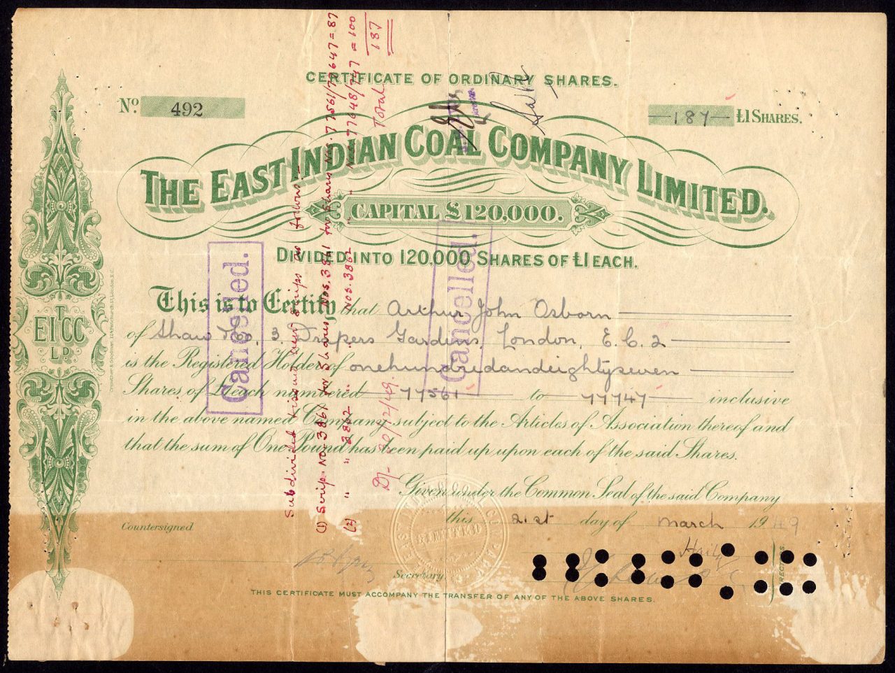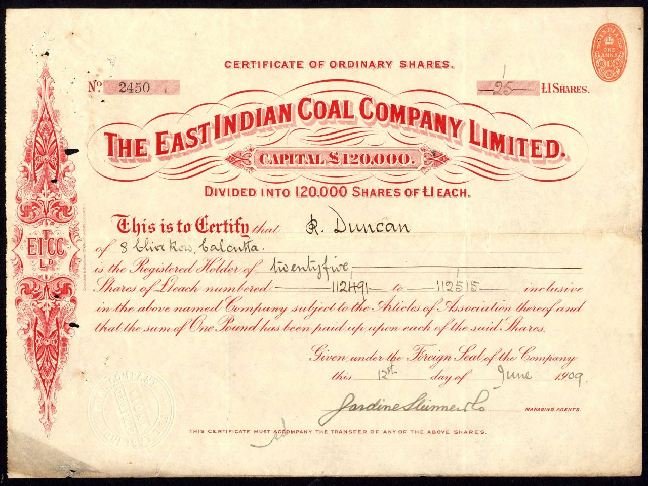 A-39974East Indian Coal Company Limited-1India1909£1 Shares - RedR1 (Più di 5000 pezzi)S1 (da 0 a 25 €)