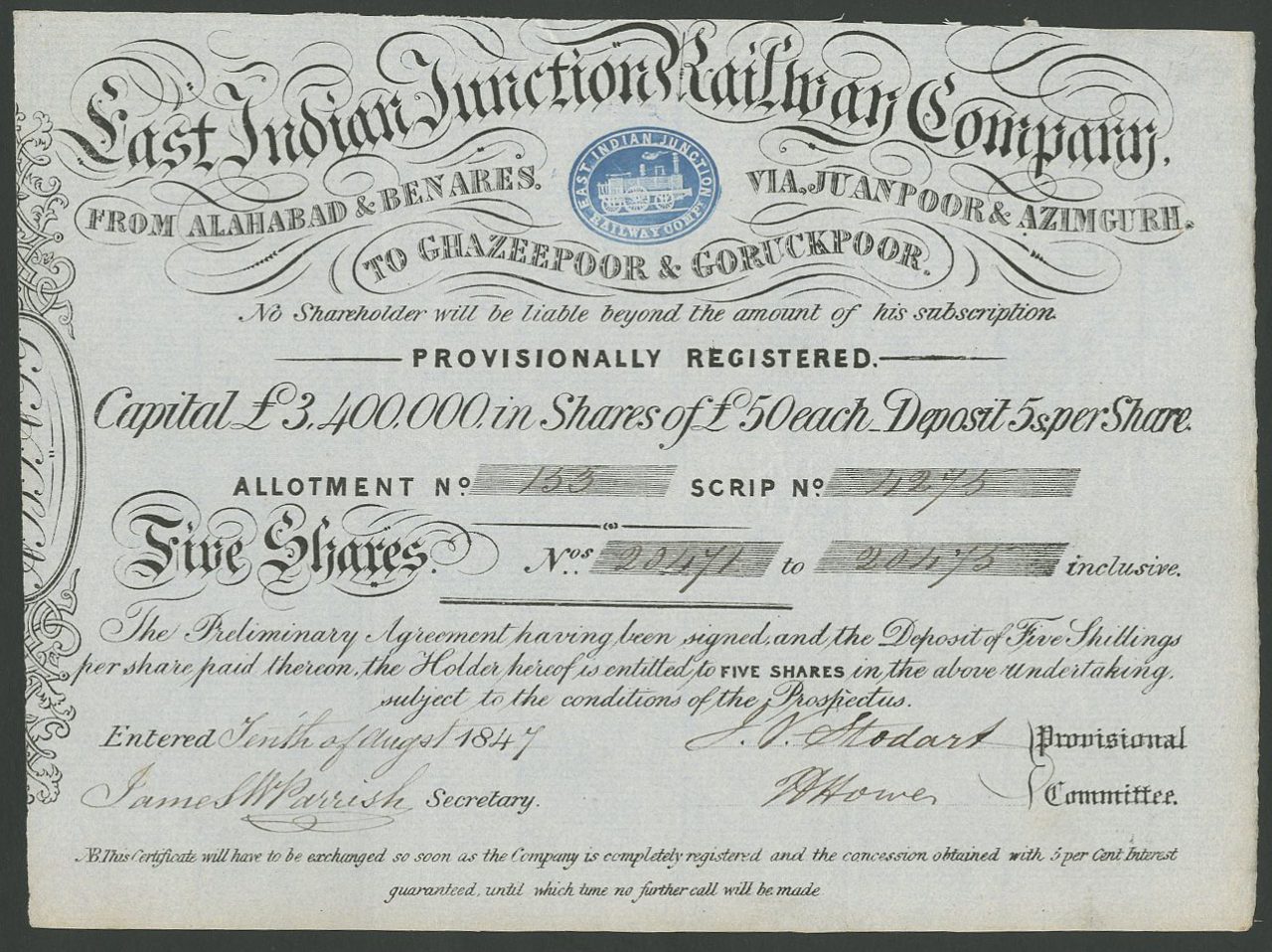 Incorporata in Gran Bretagna per costruire una ferrovia da Alahabad e Benares via Juanpoor e Azimgurn a Ghazeepoor e Goruckpoor. Progetto abbandonato?